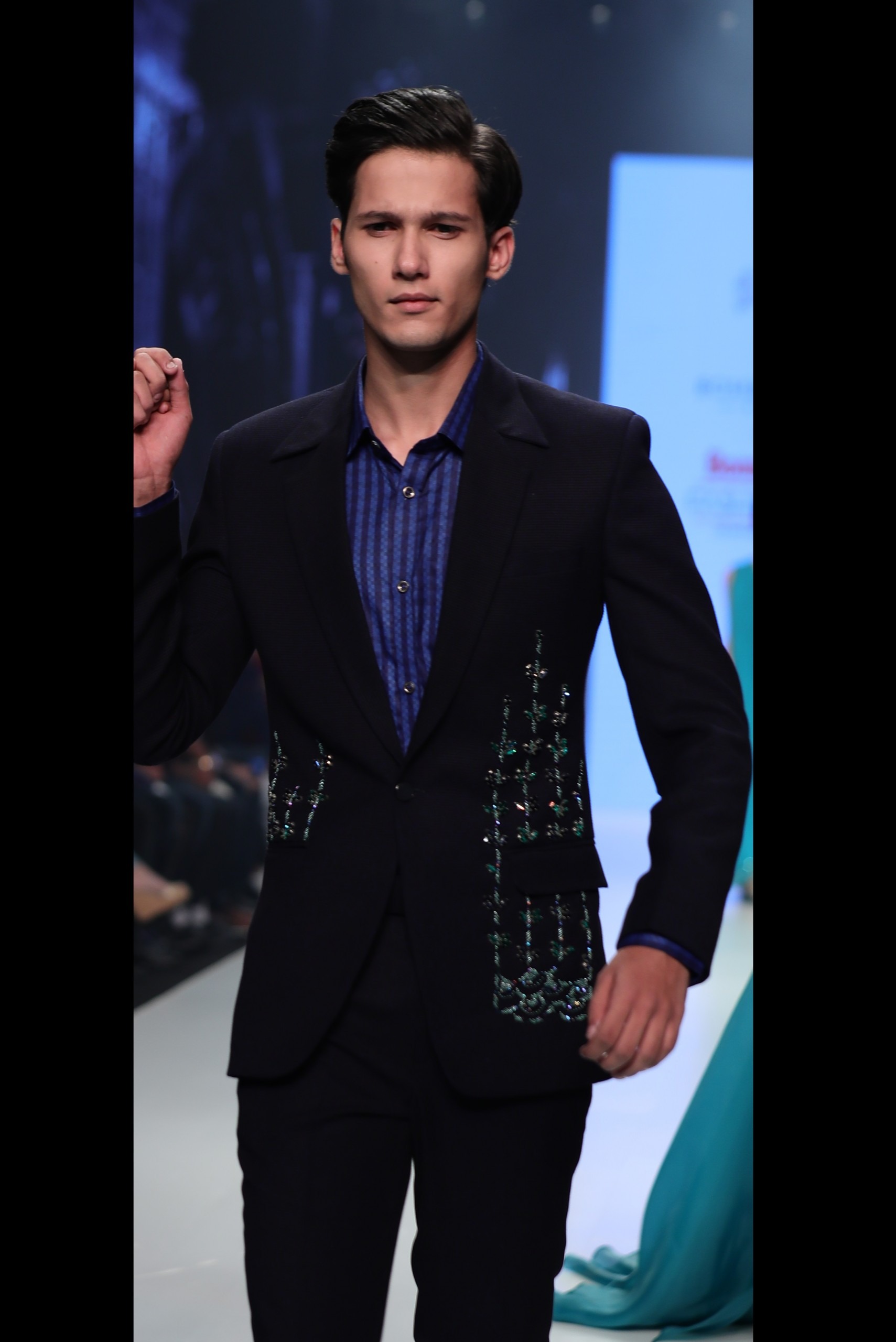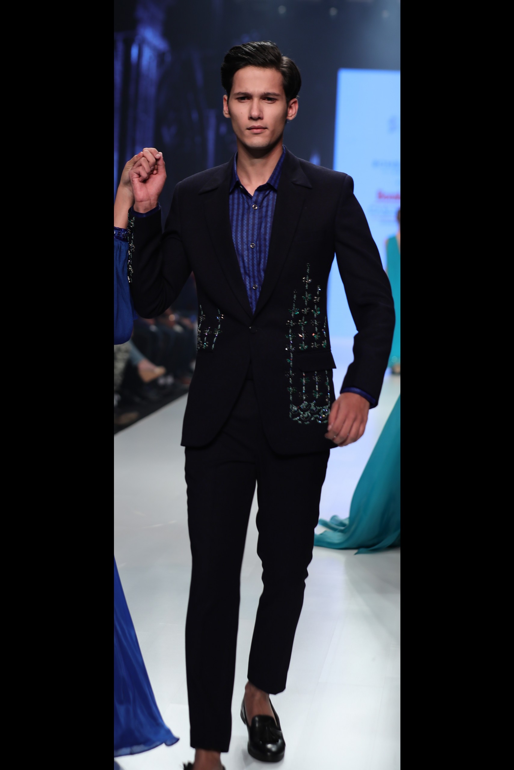 This suit is featured with black&blue textured fabric, paired with indigo stripe shirt and highlighted with embroidery.