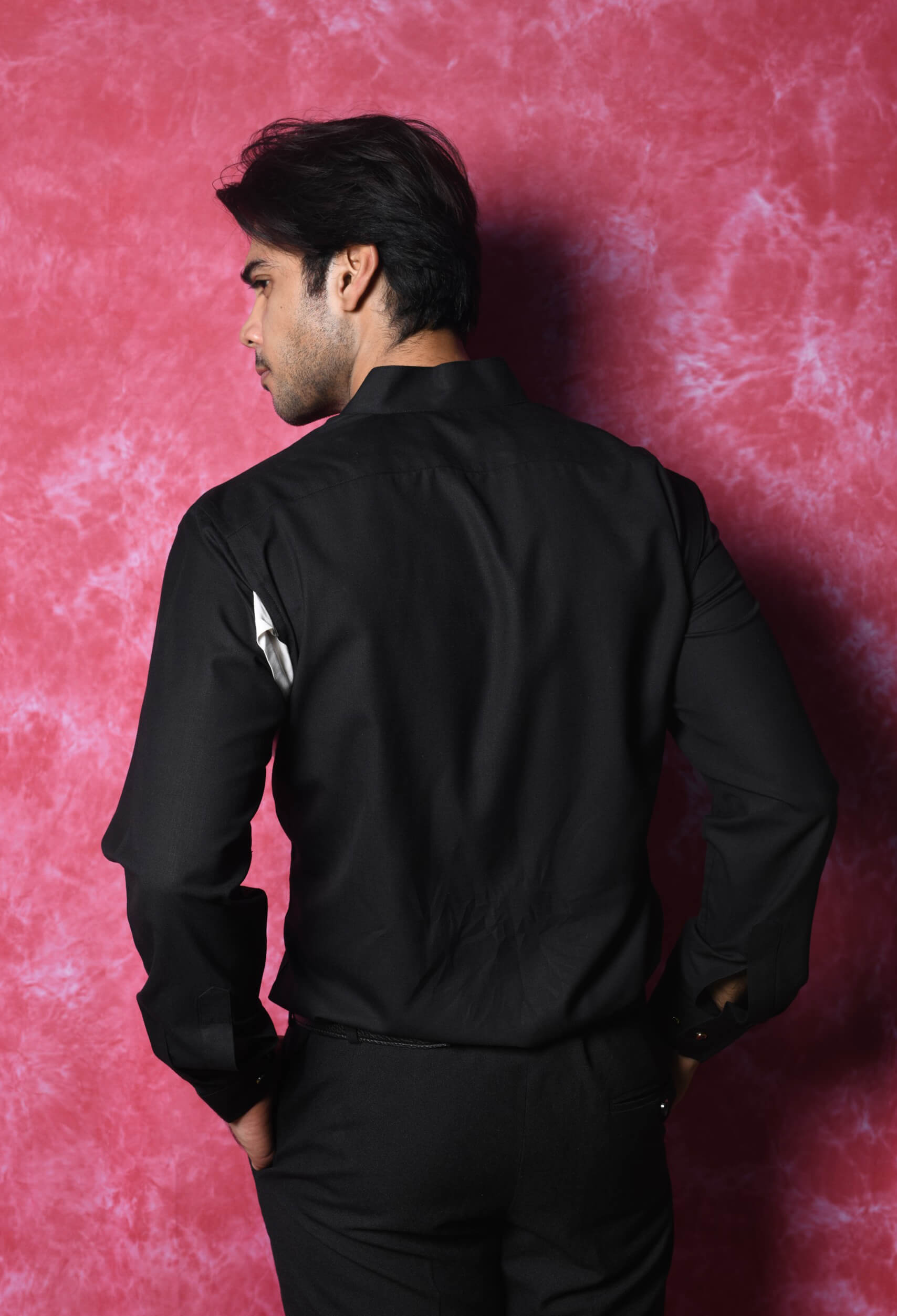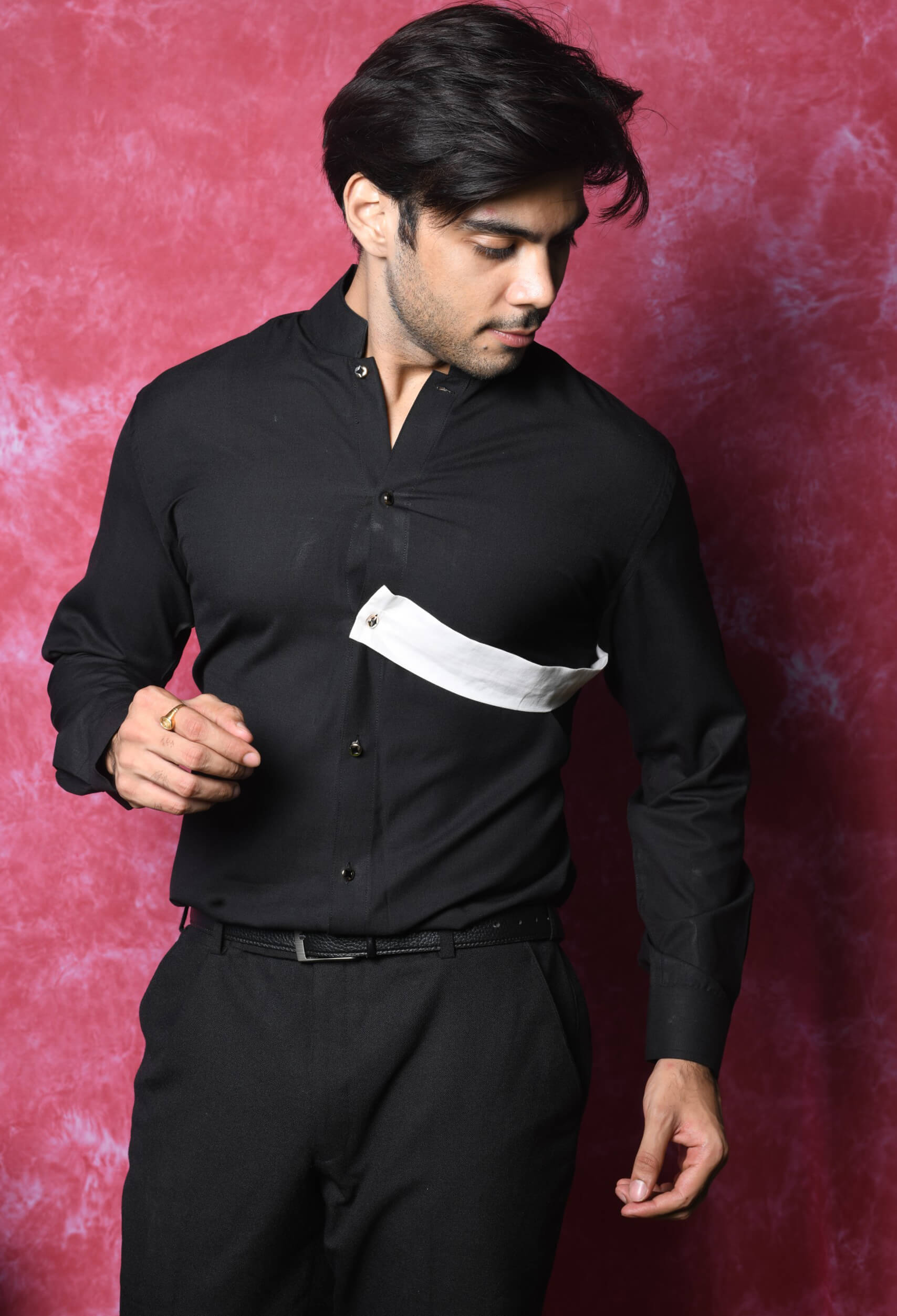 The prints Shirt Edition- black Classy shirt styled with white belt with Mandarin collar.