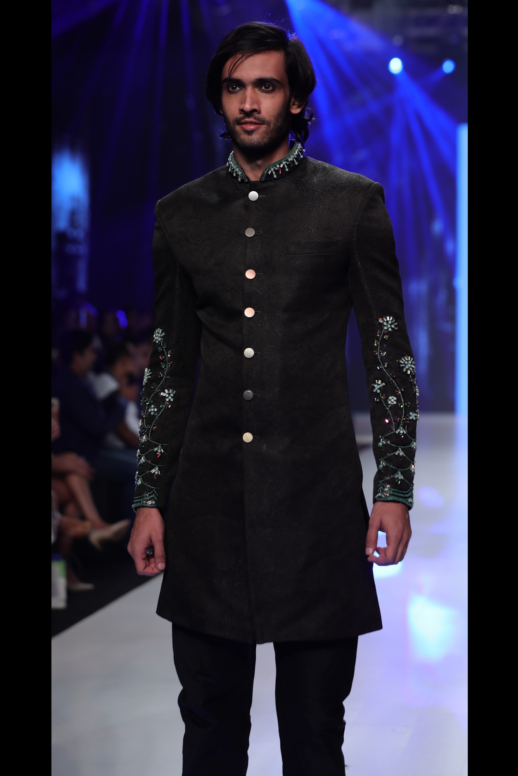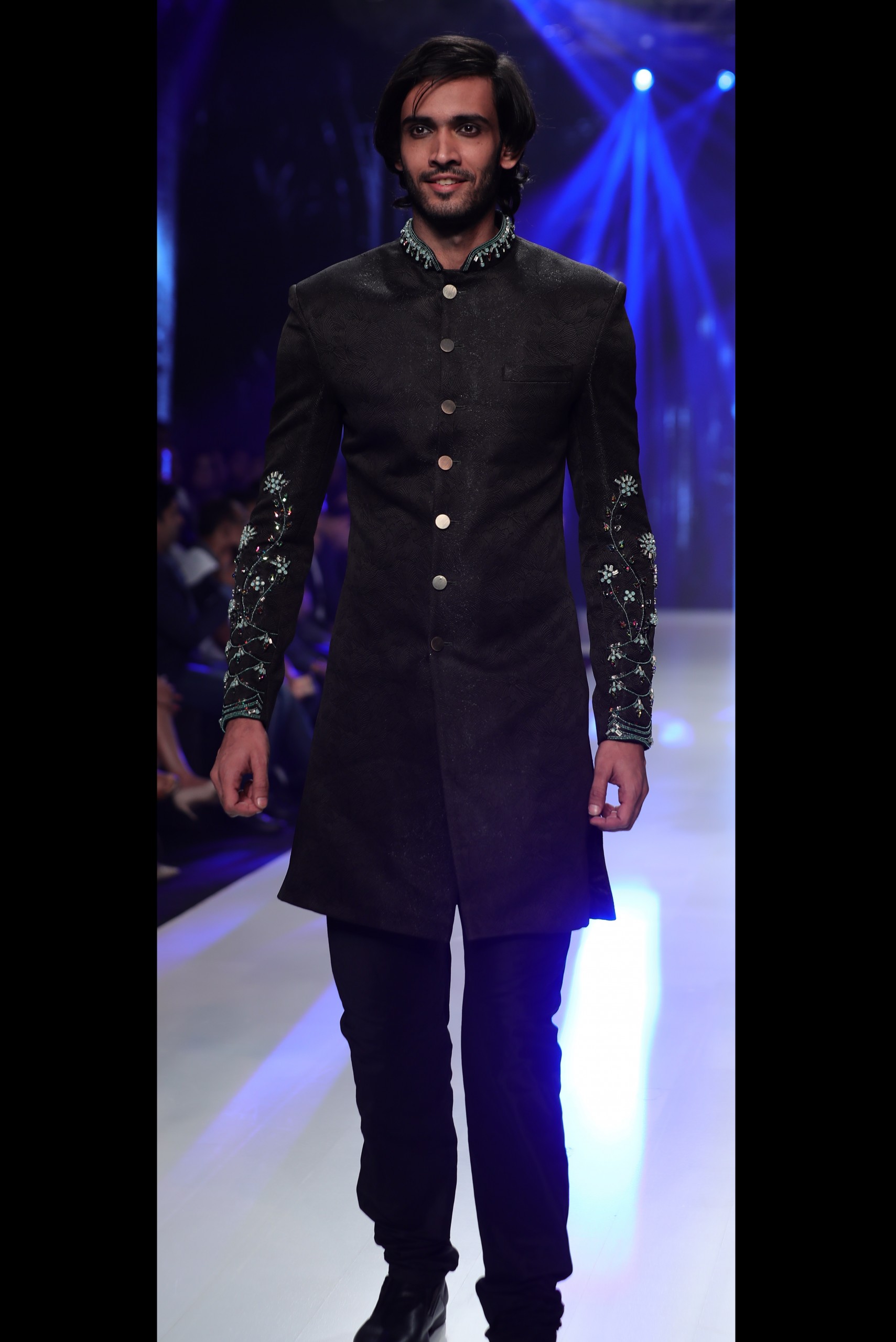 This black sherwani is made out of shiny textured fabric and embellished with crystals at collar and sleeves.