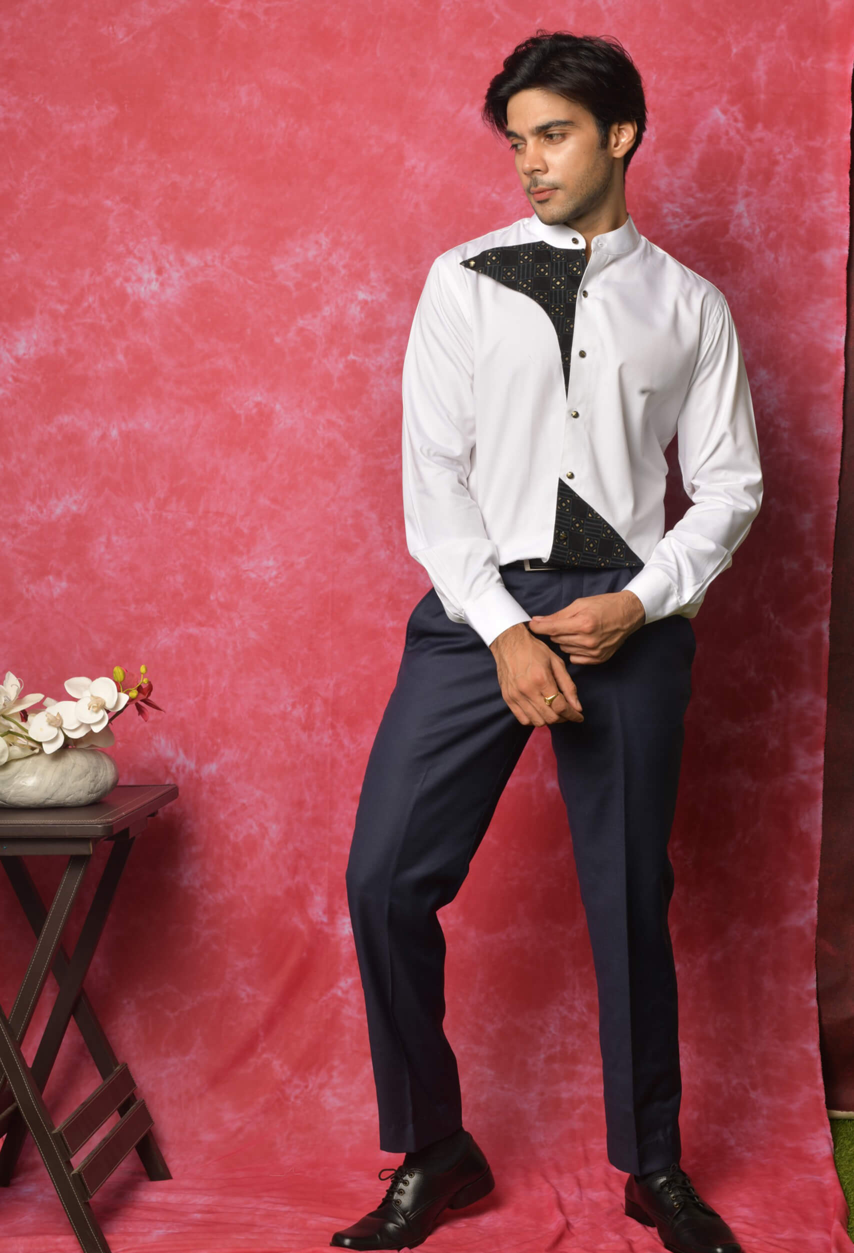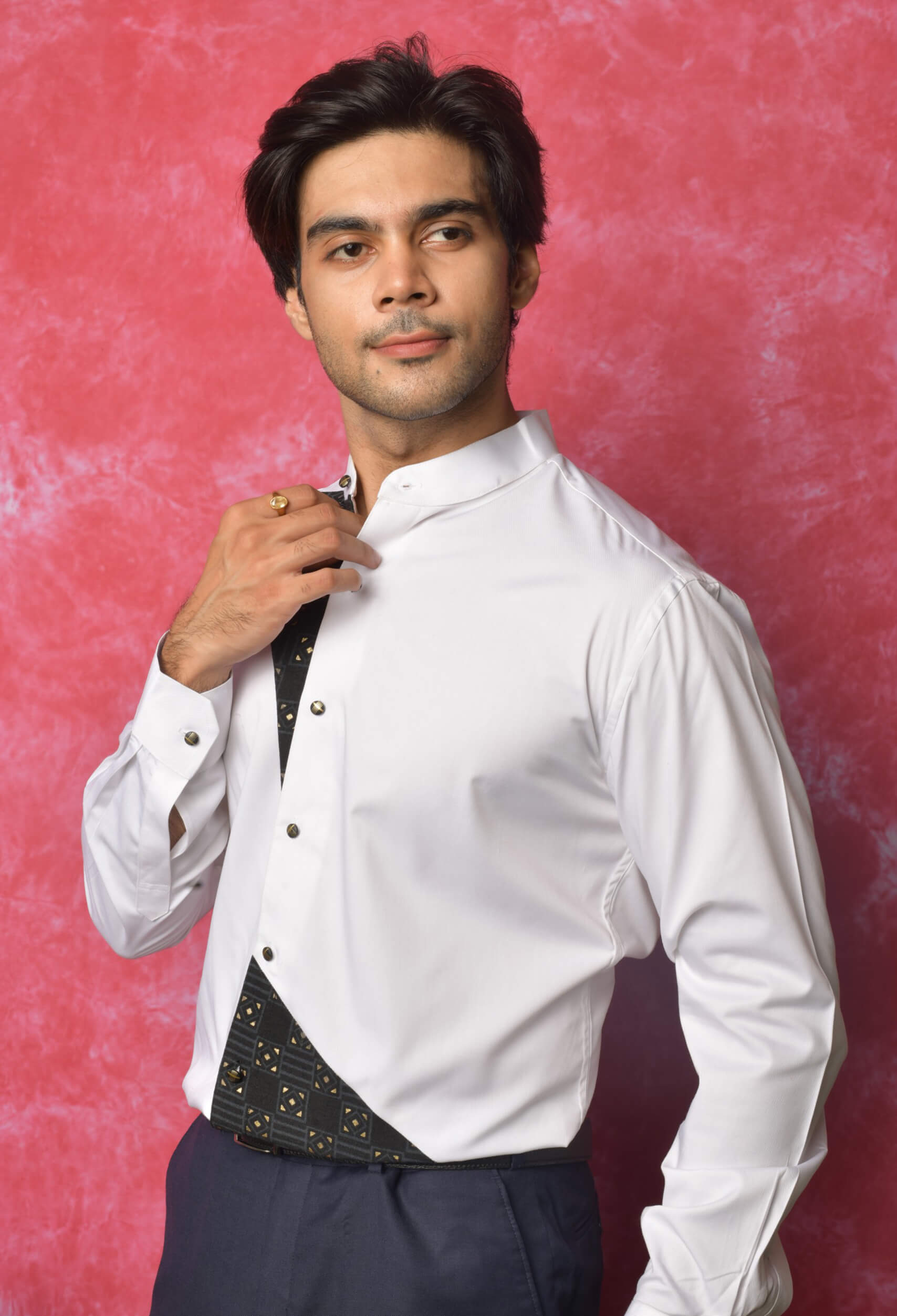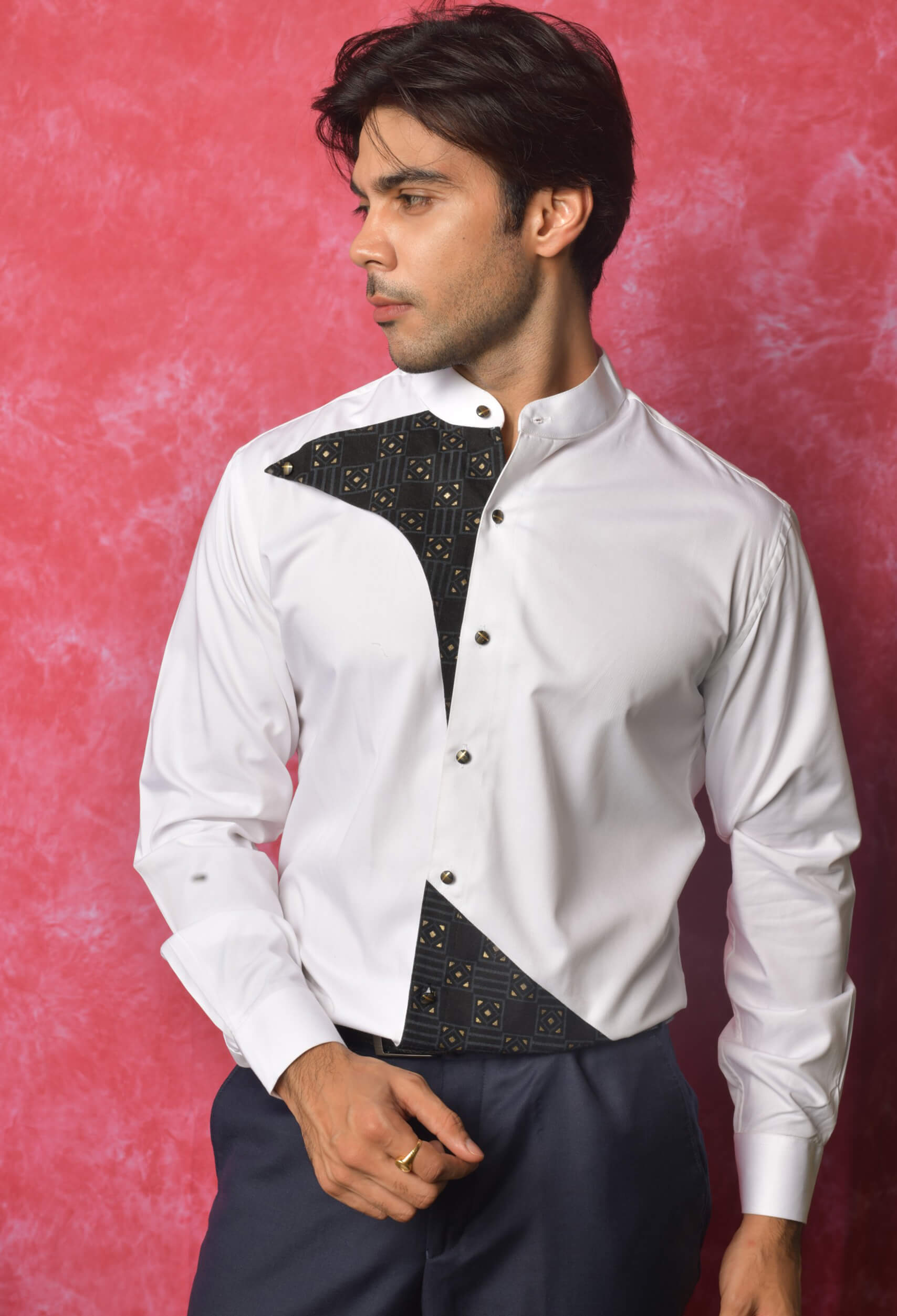 The White Edition- col officier collar with prints embellished with black gold buttons.