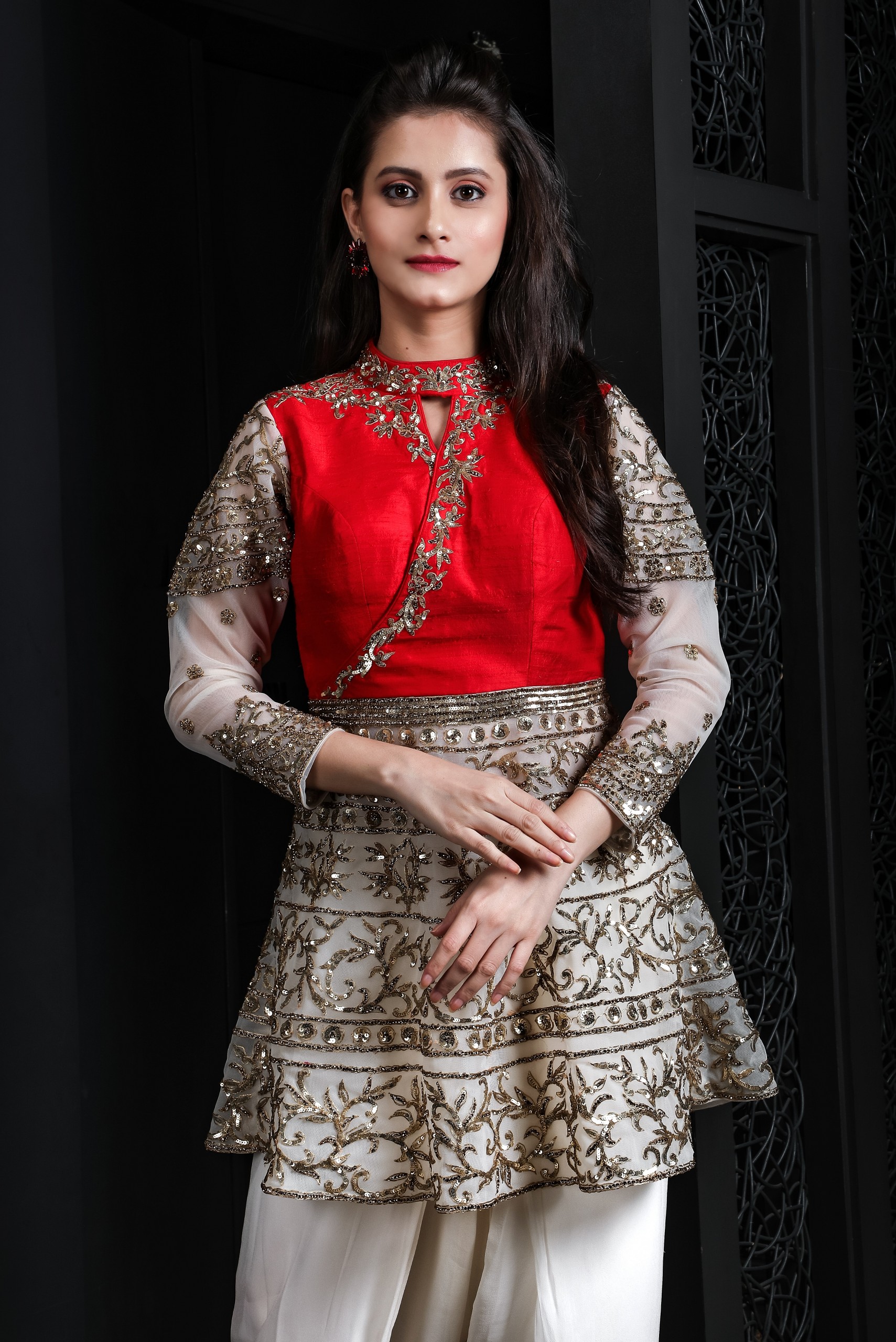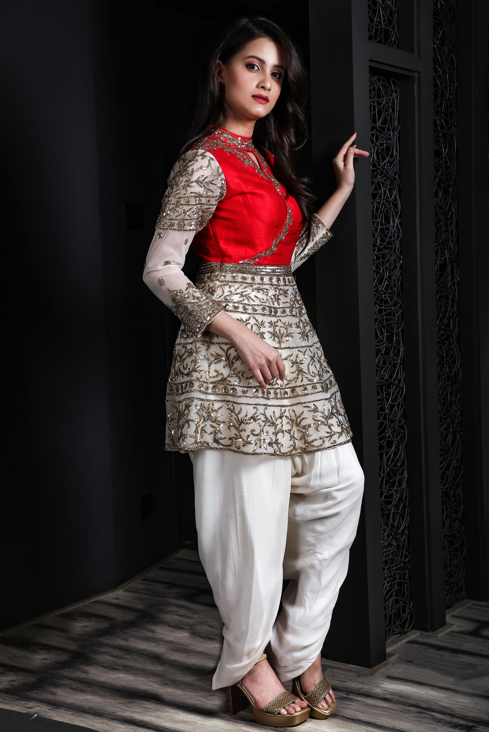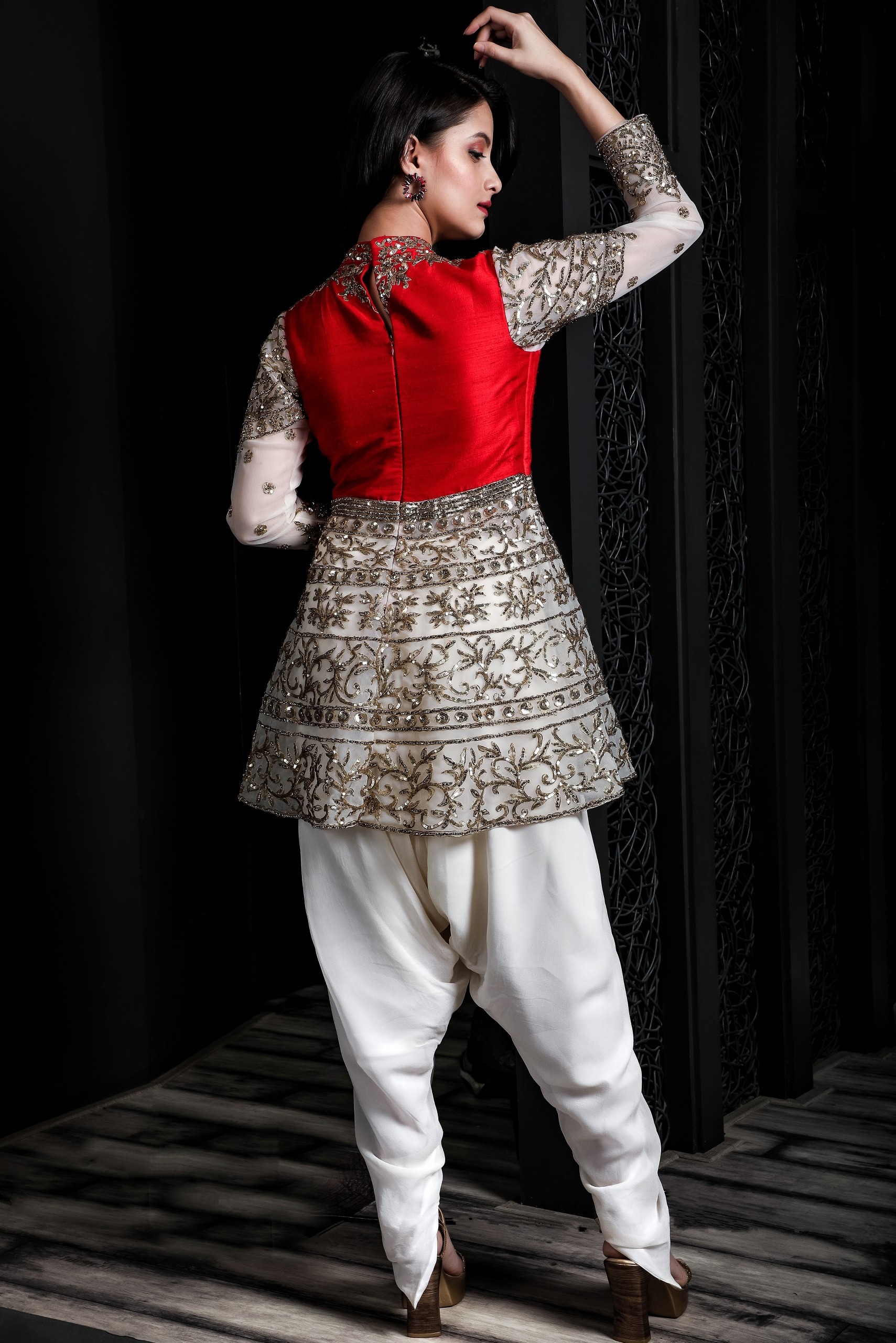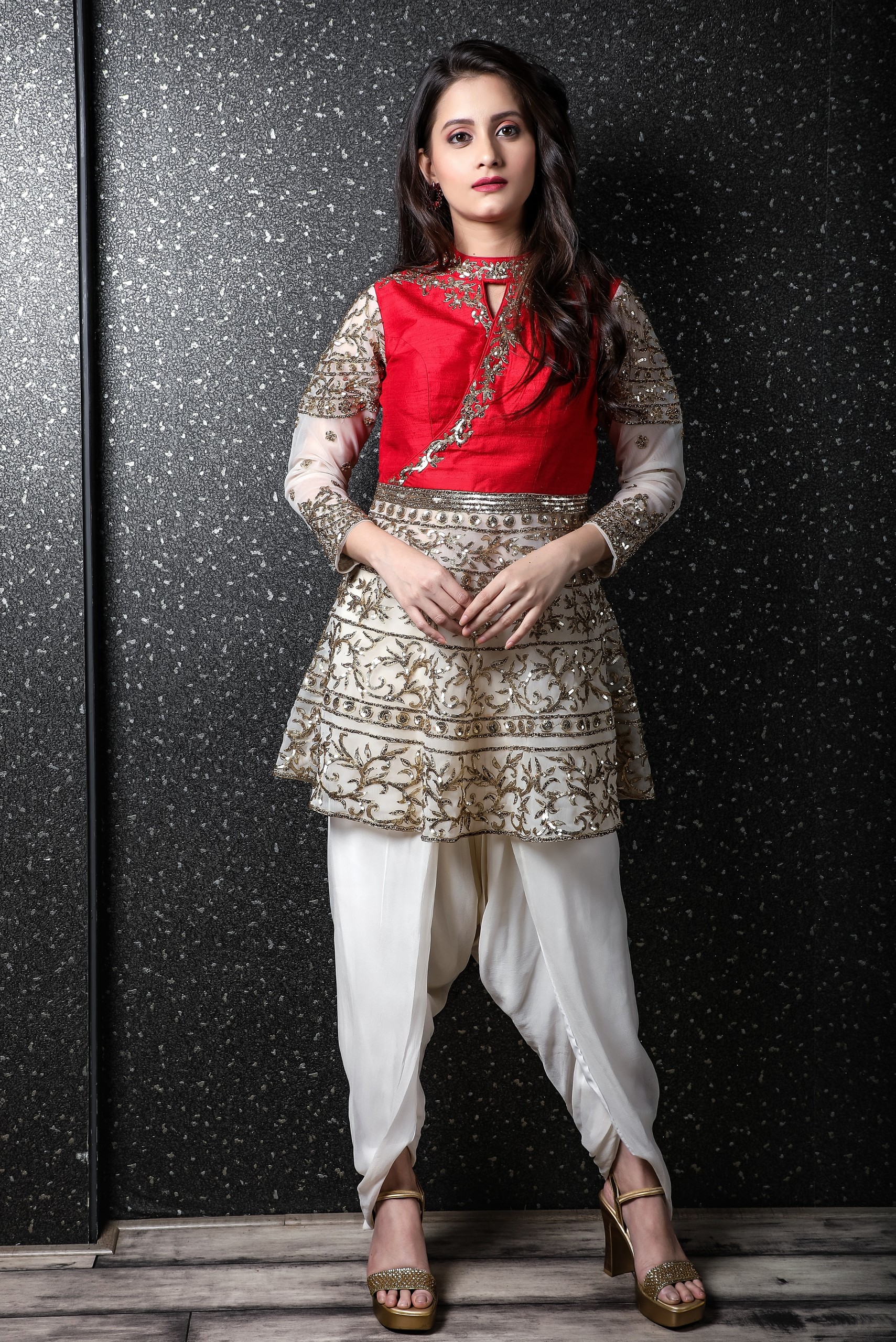 This outfit is made of chiffon ivory dhoti paired with short knee length dress embellished with stones and sequins work.