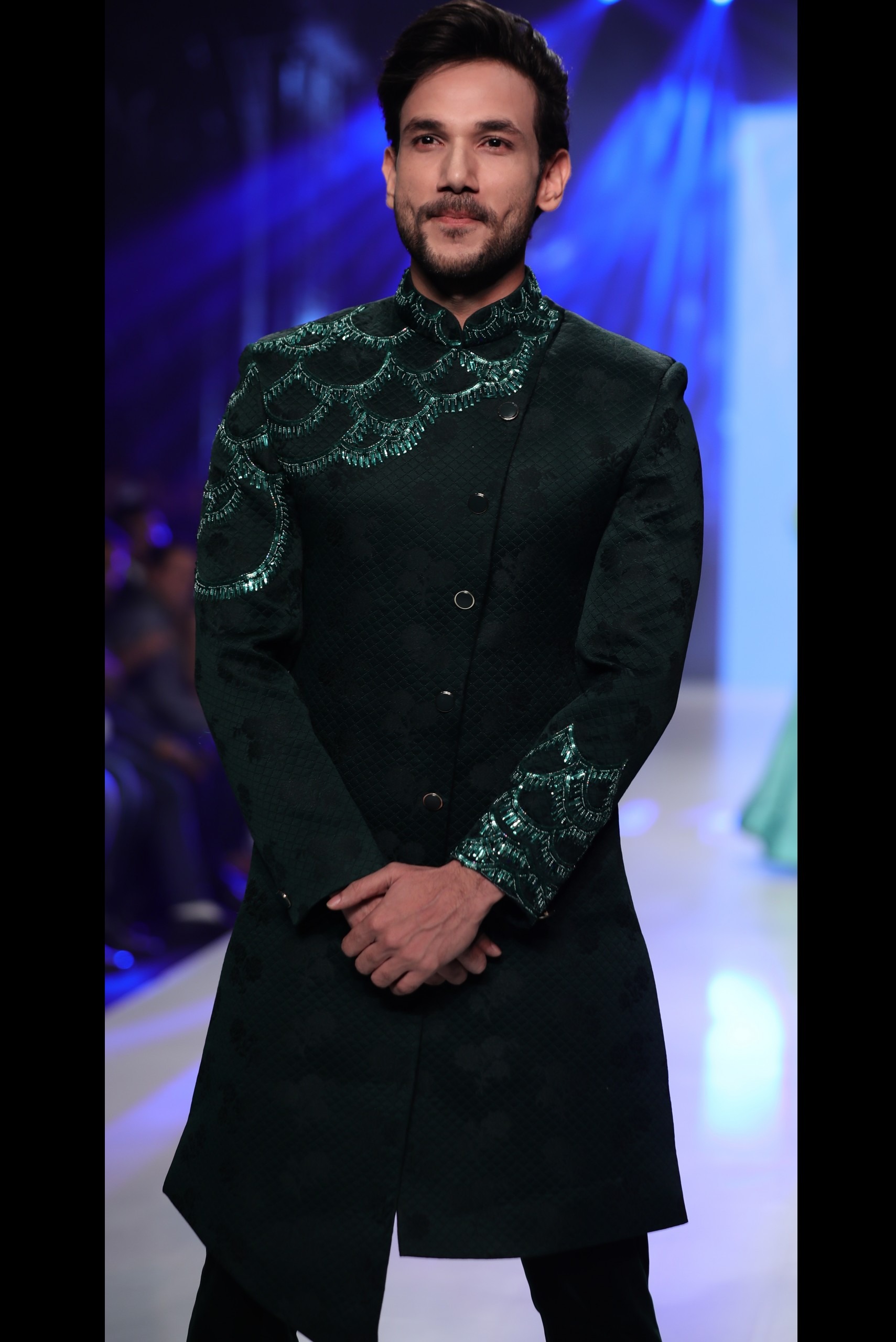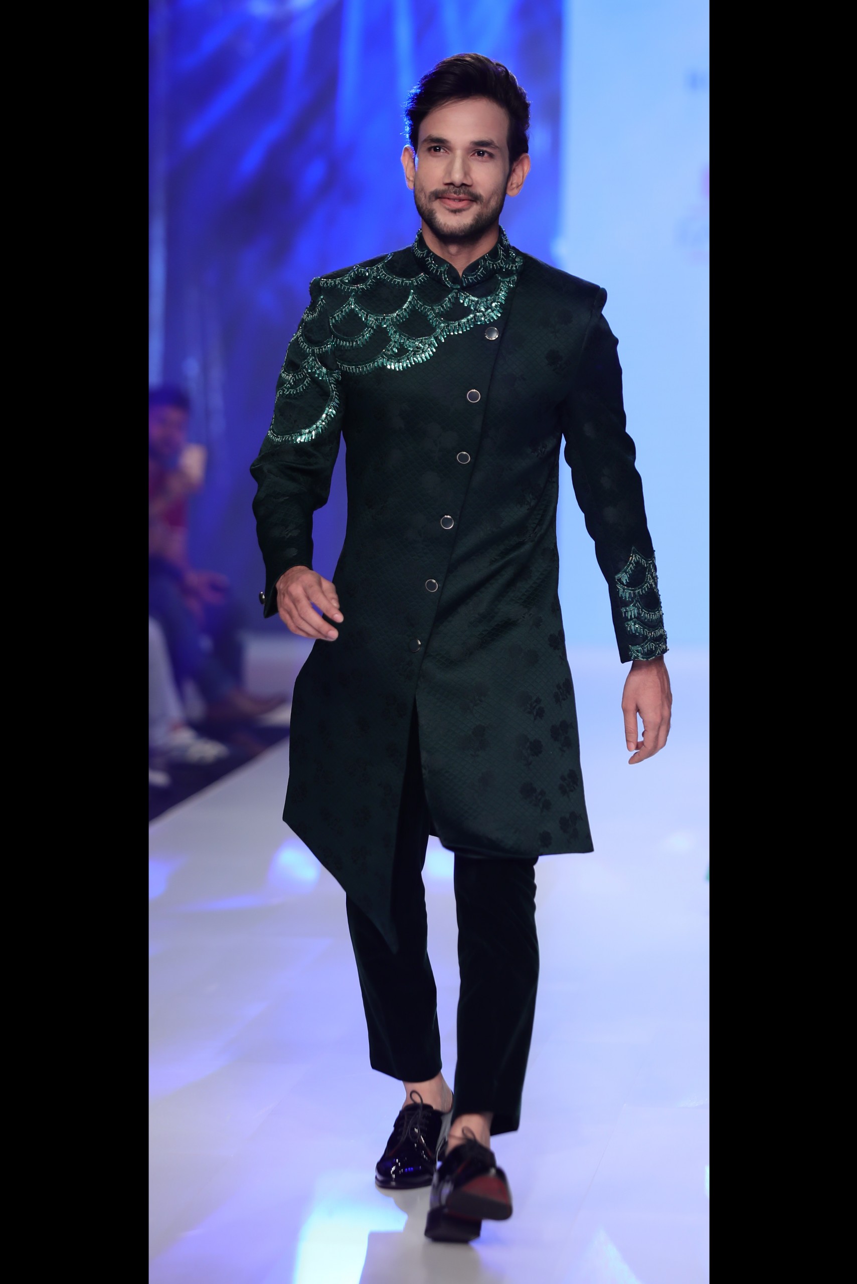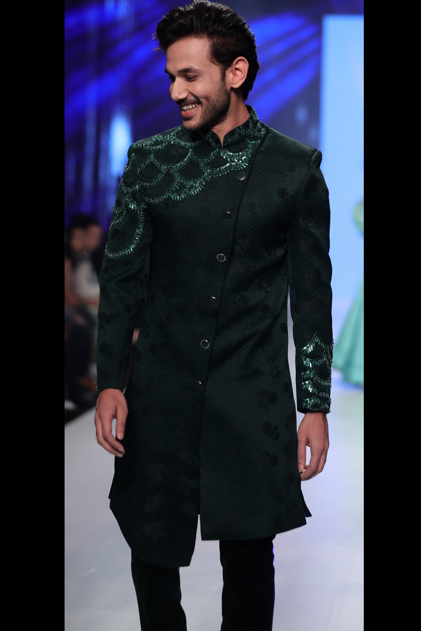 This emerald sherwani is made out of textured fabric and embellished with crystals at the shoulders and sleeves