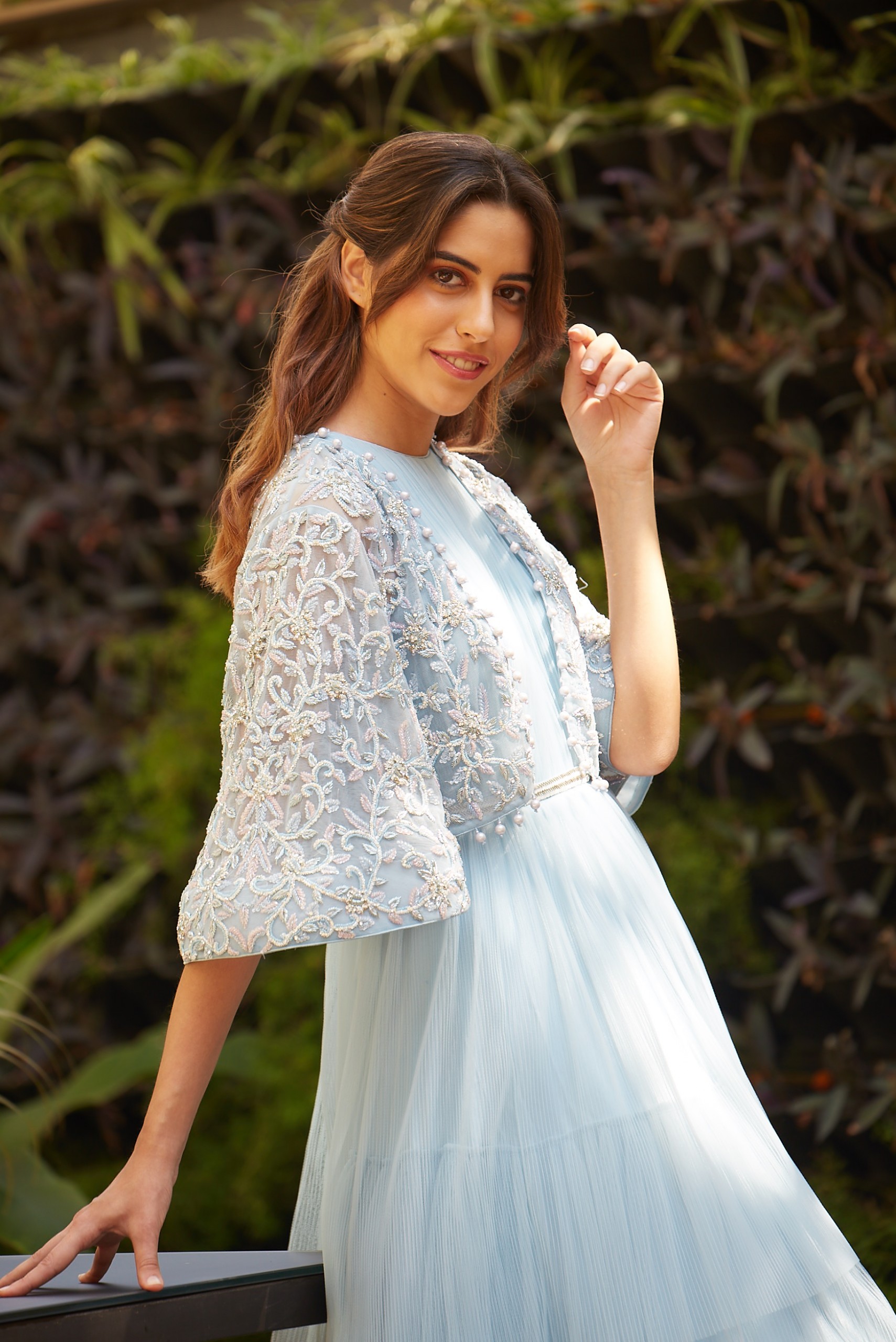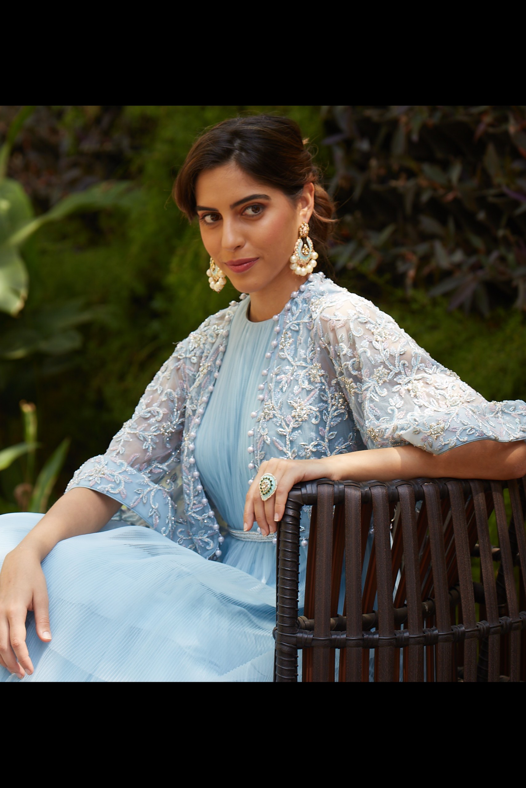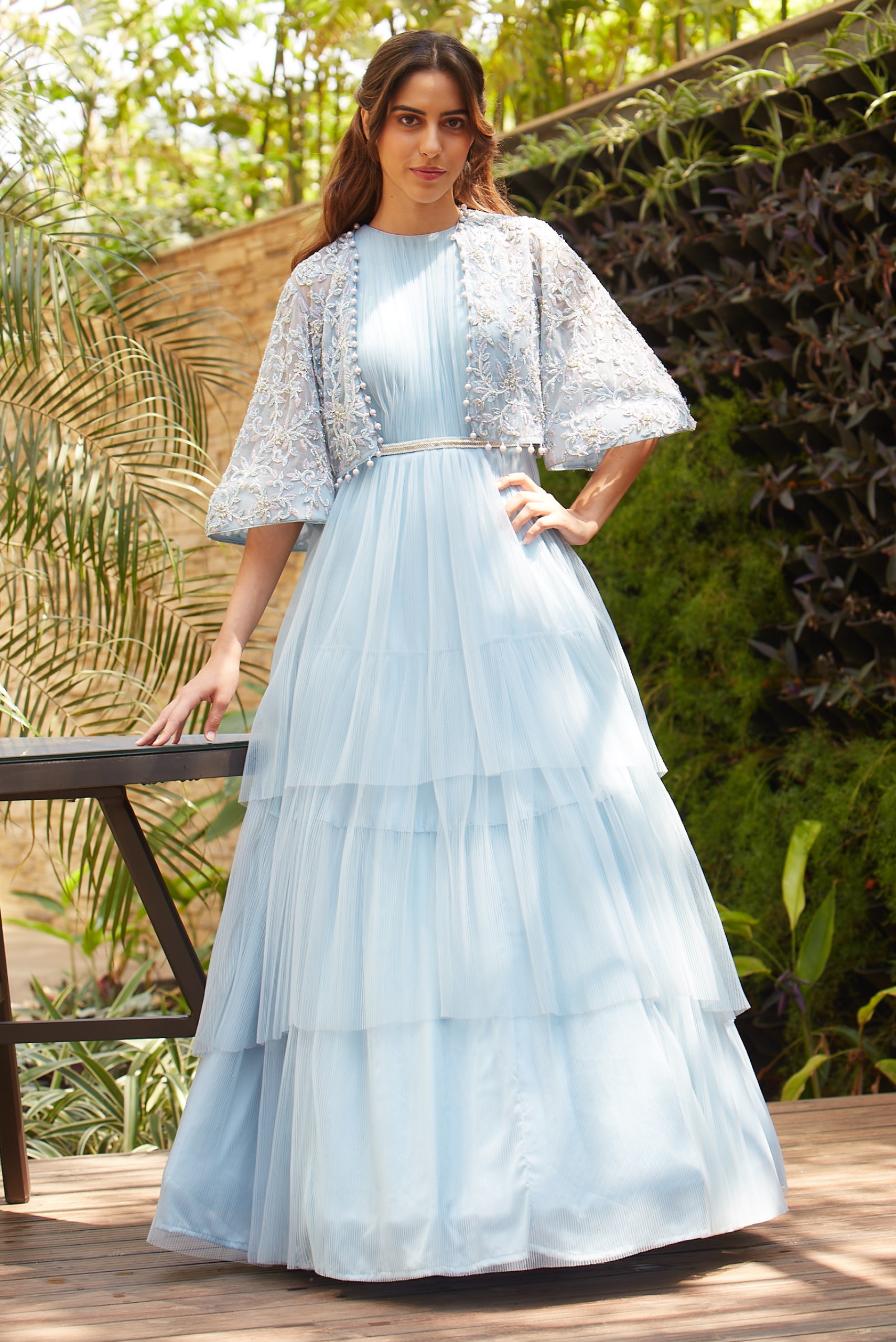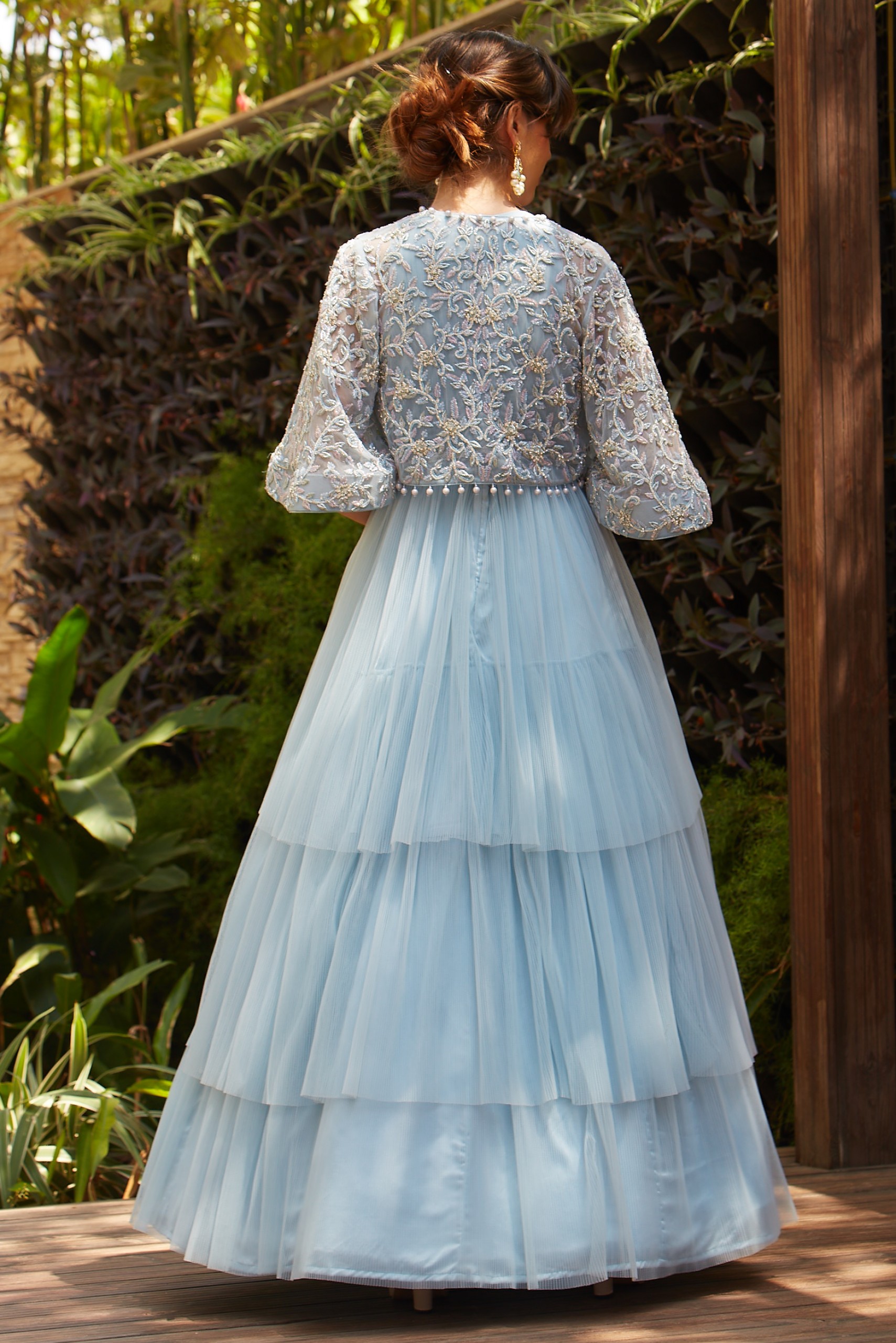 Frilled tear gown with zardosi bell sleeves jacket with emblished zardosi belt.