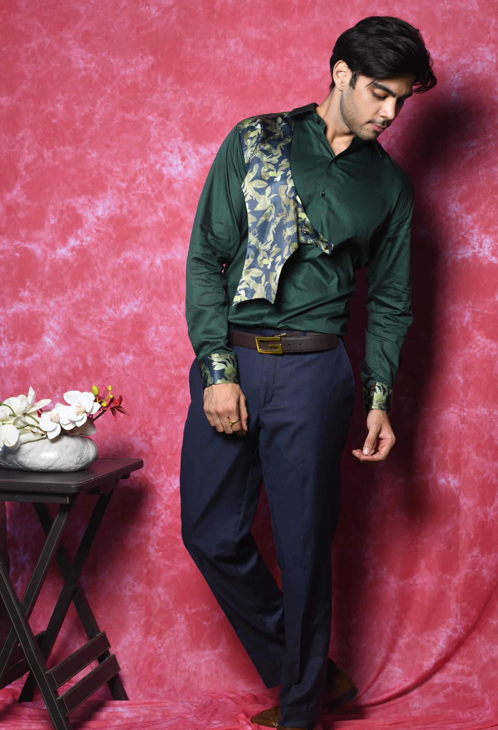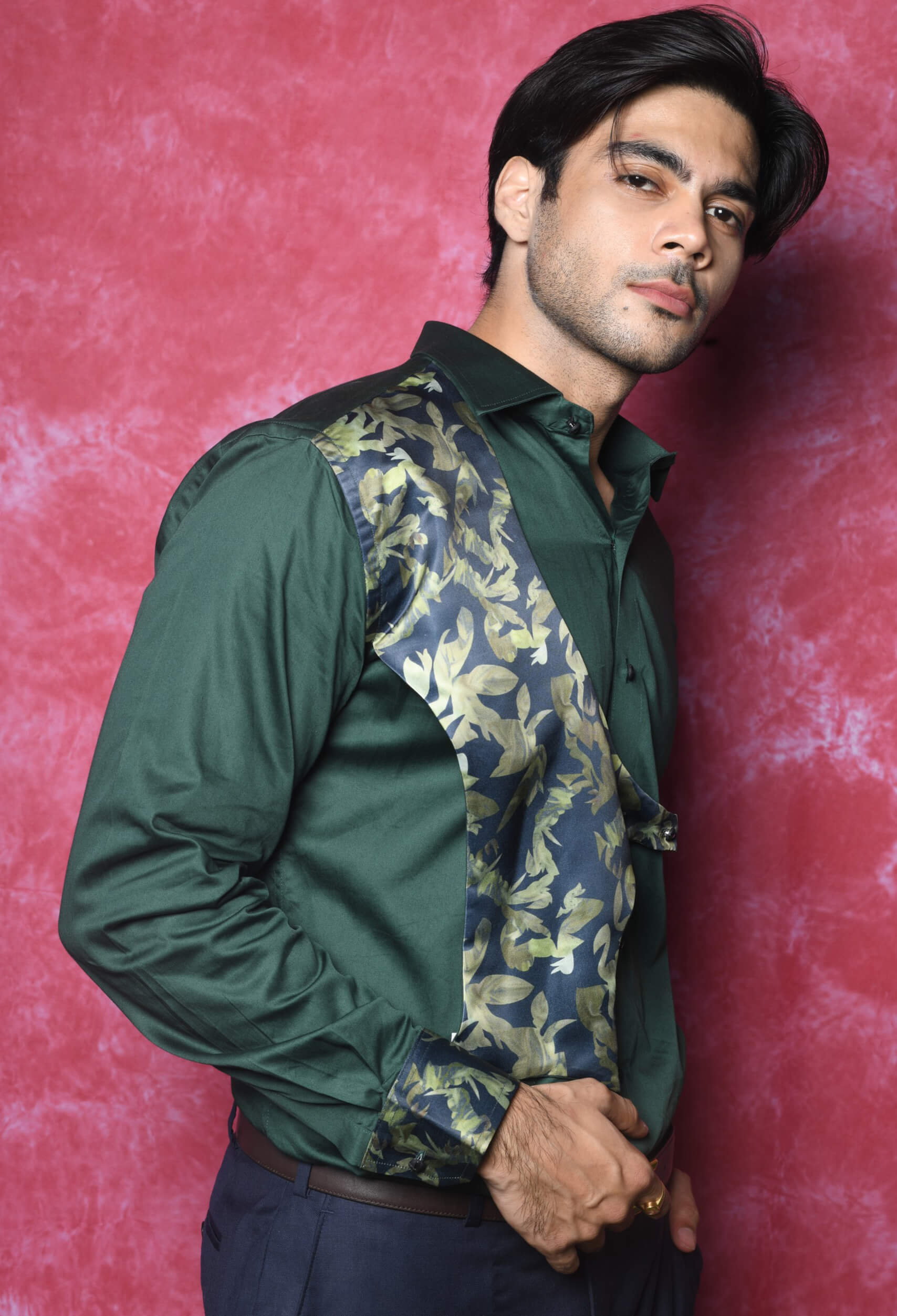 The prints Shirt Edition- Knit Collar shirt with one side jacket styled print with cuff printed sleeves embellished with buttons.