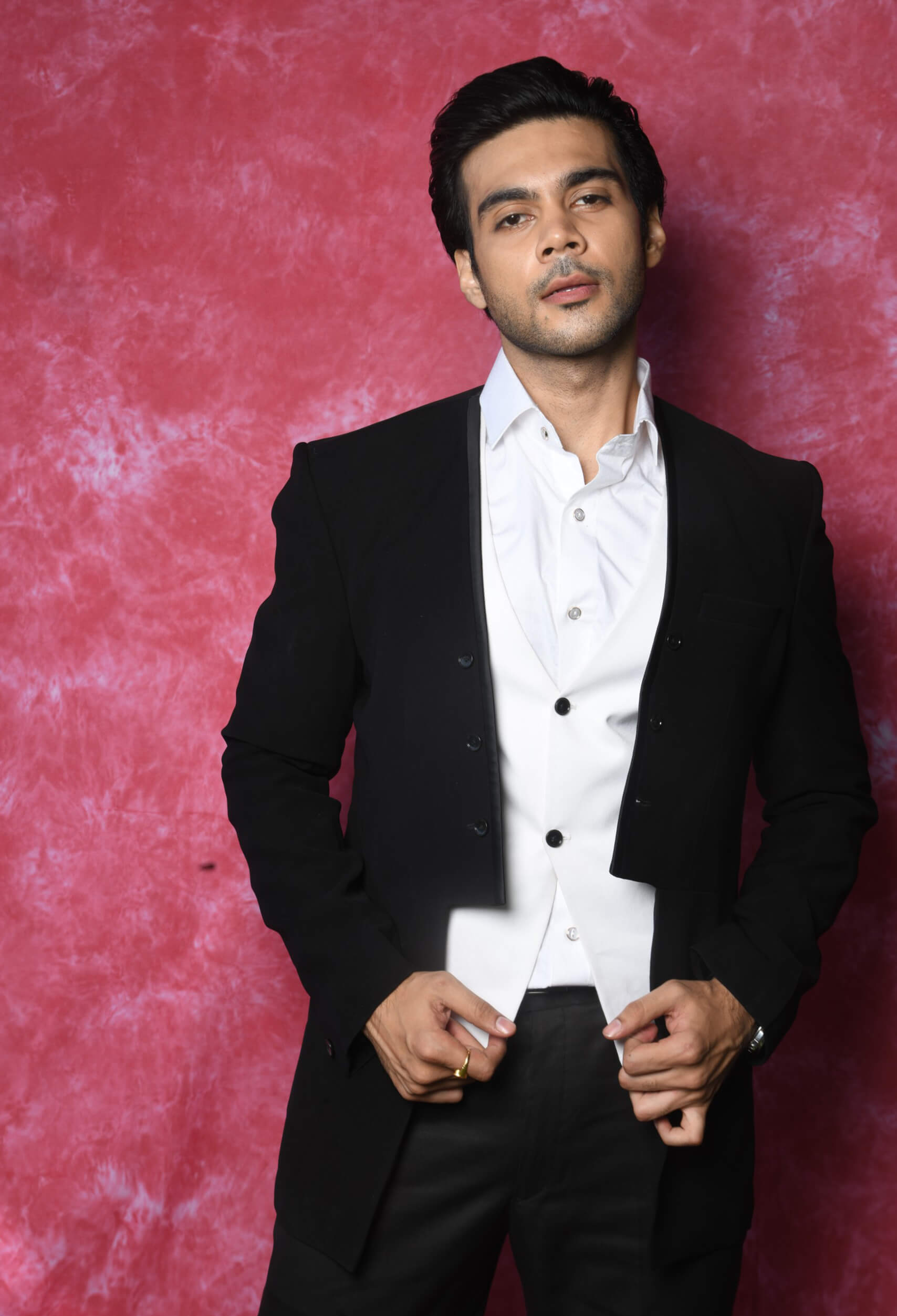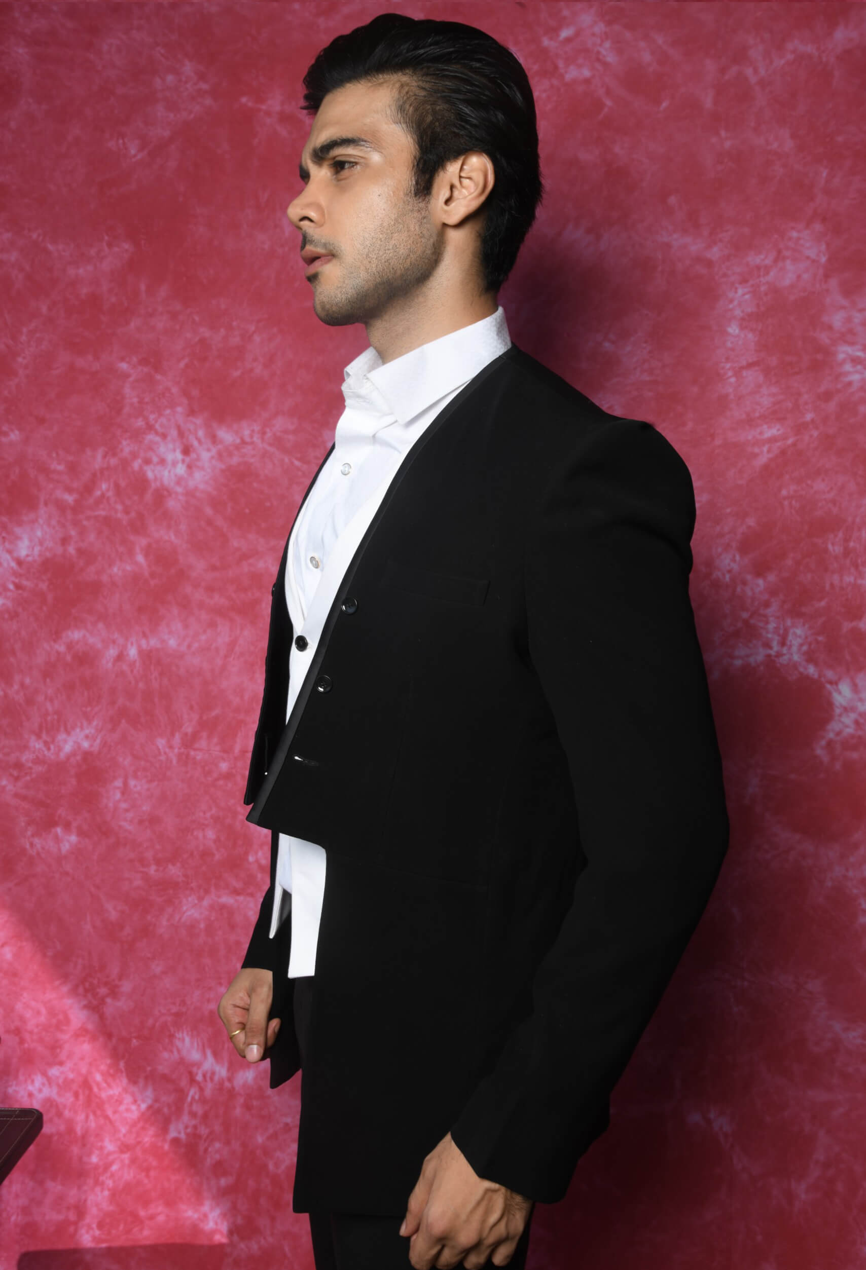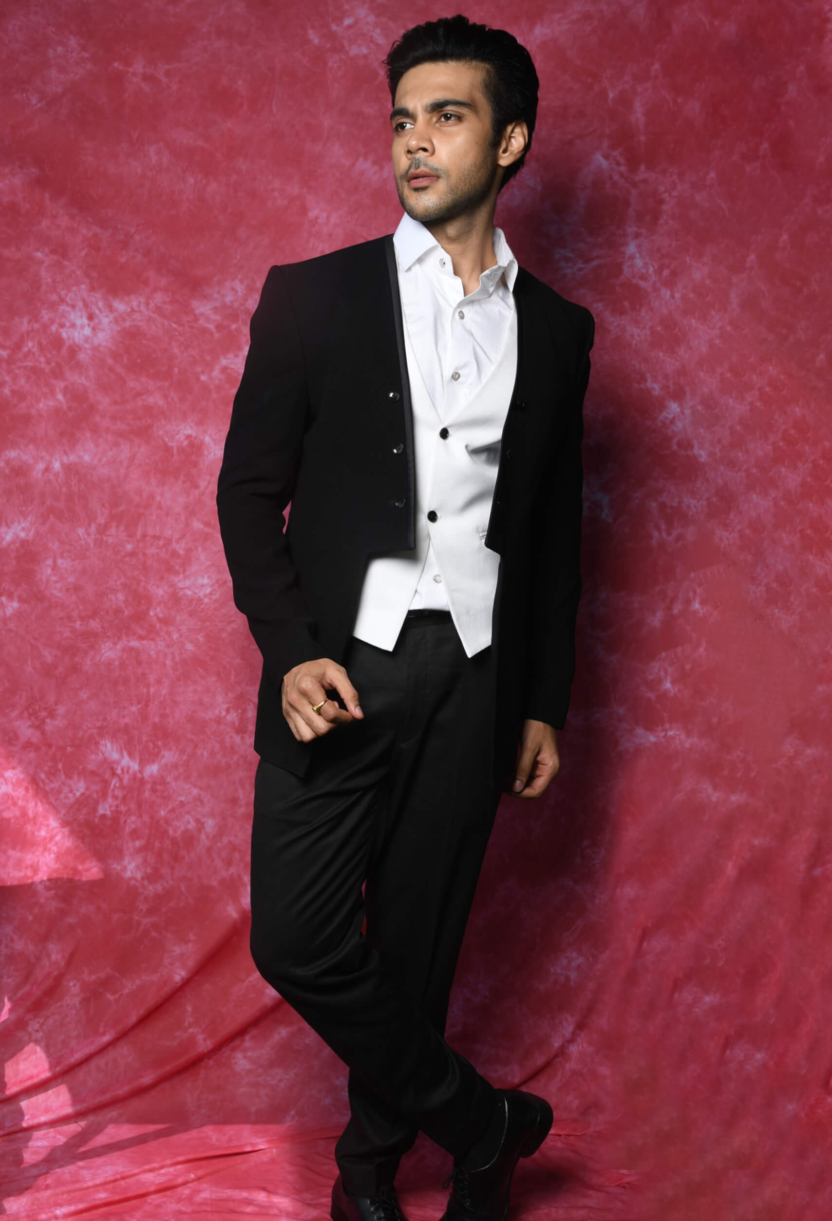 Four piece set, knit collar shirt with vest coat and designer blazer with black pants.
