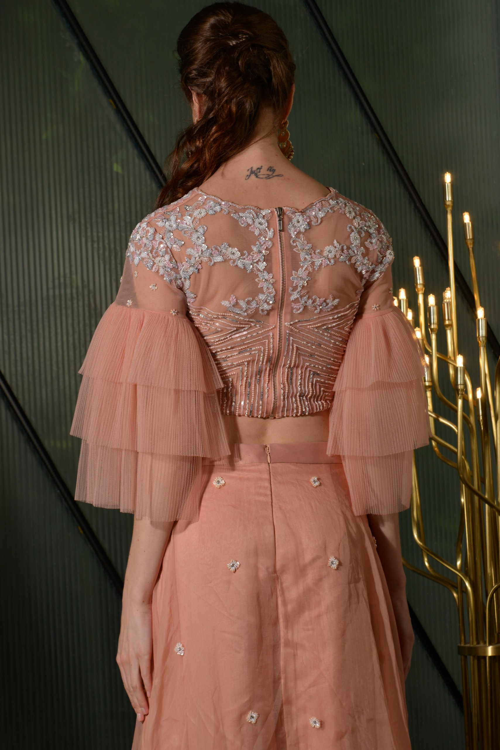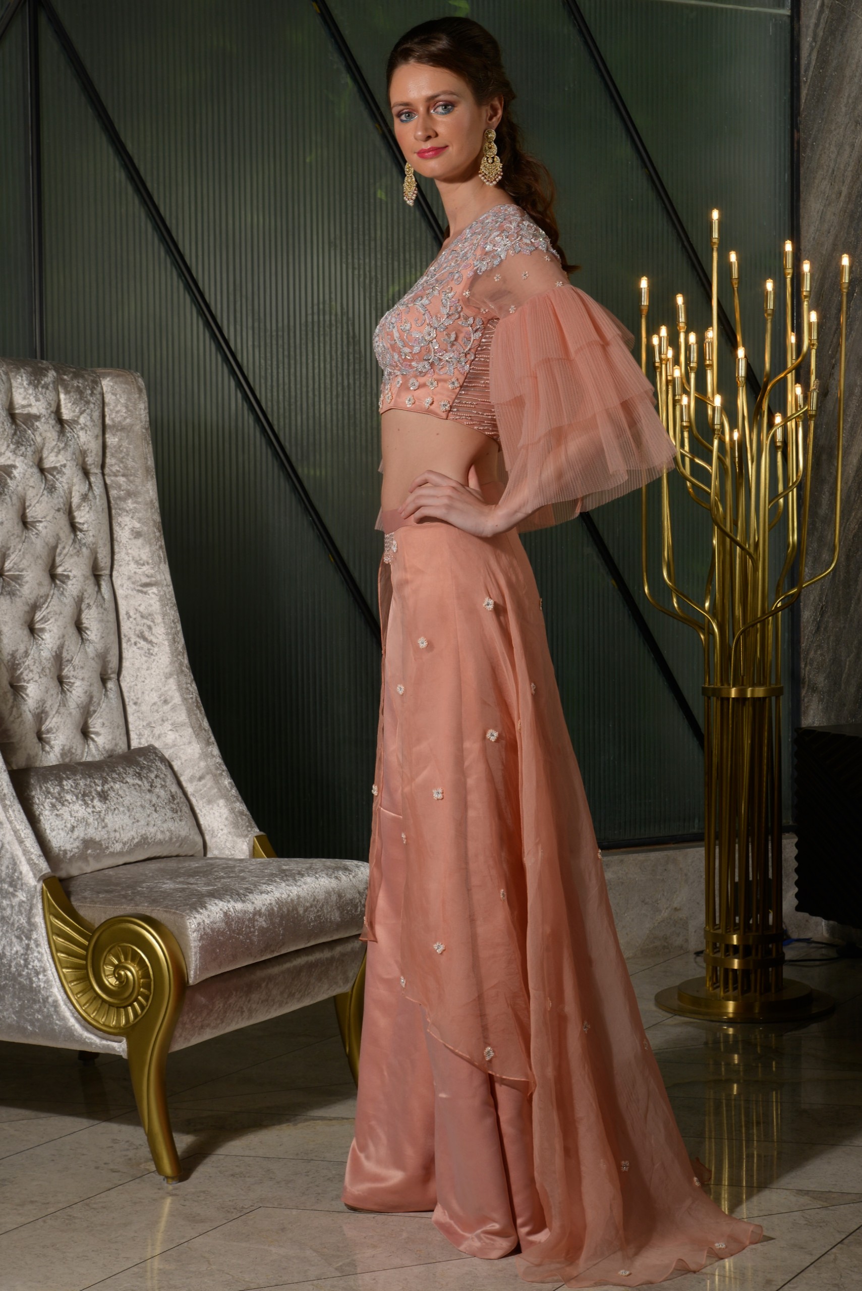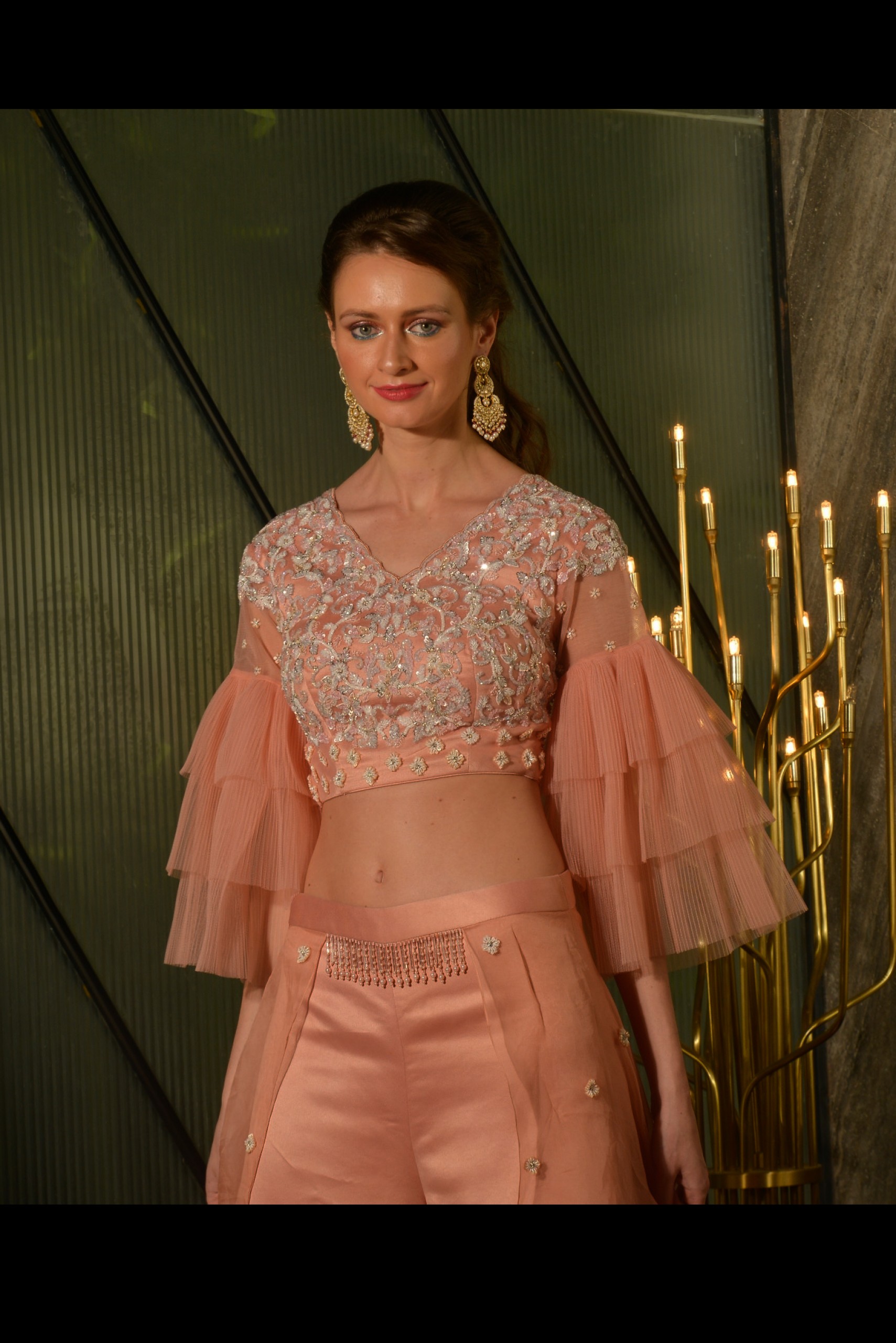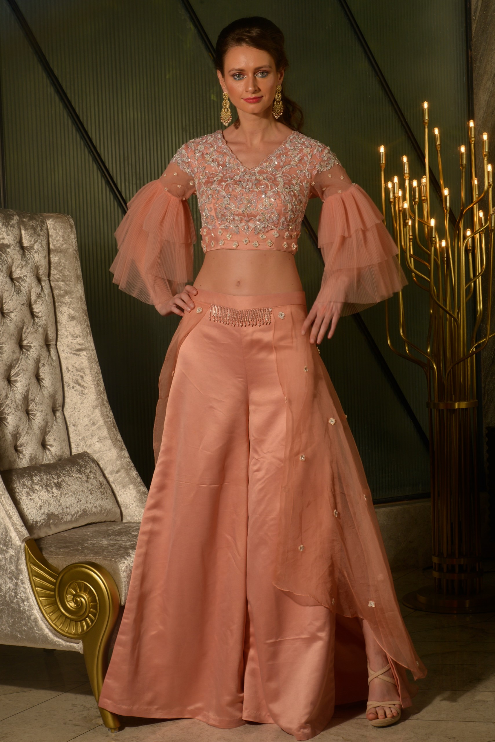 This peach top is embroidered with zari work and layered frilled sleeves palazzo pant made of chiffon trail butti emblishment on it.