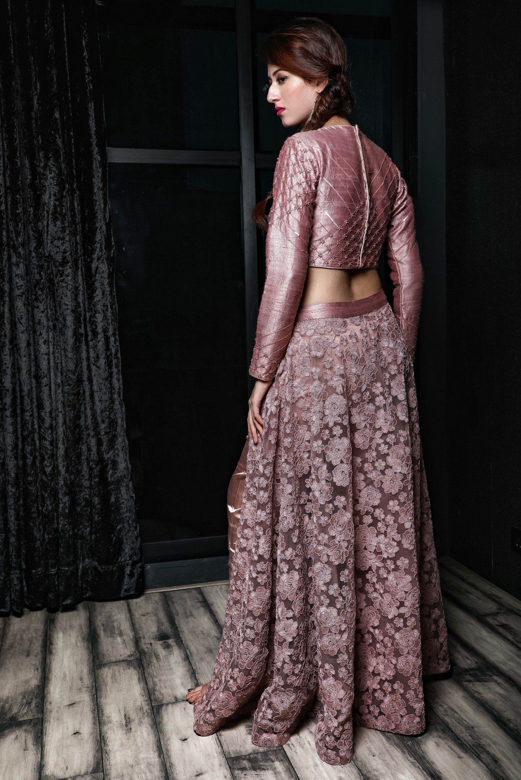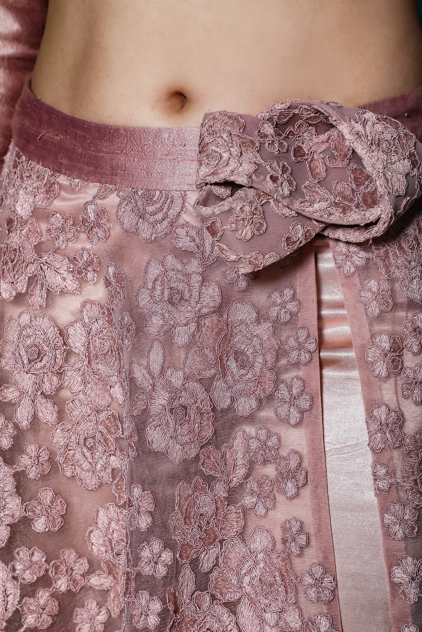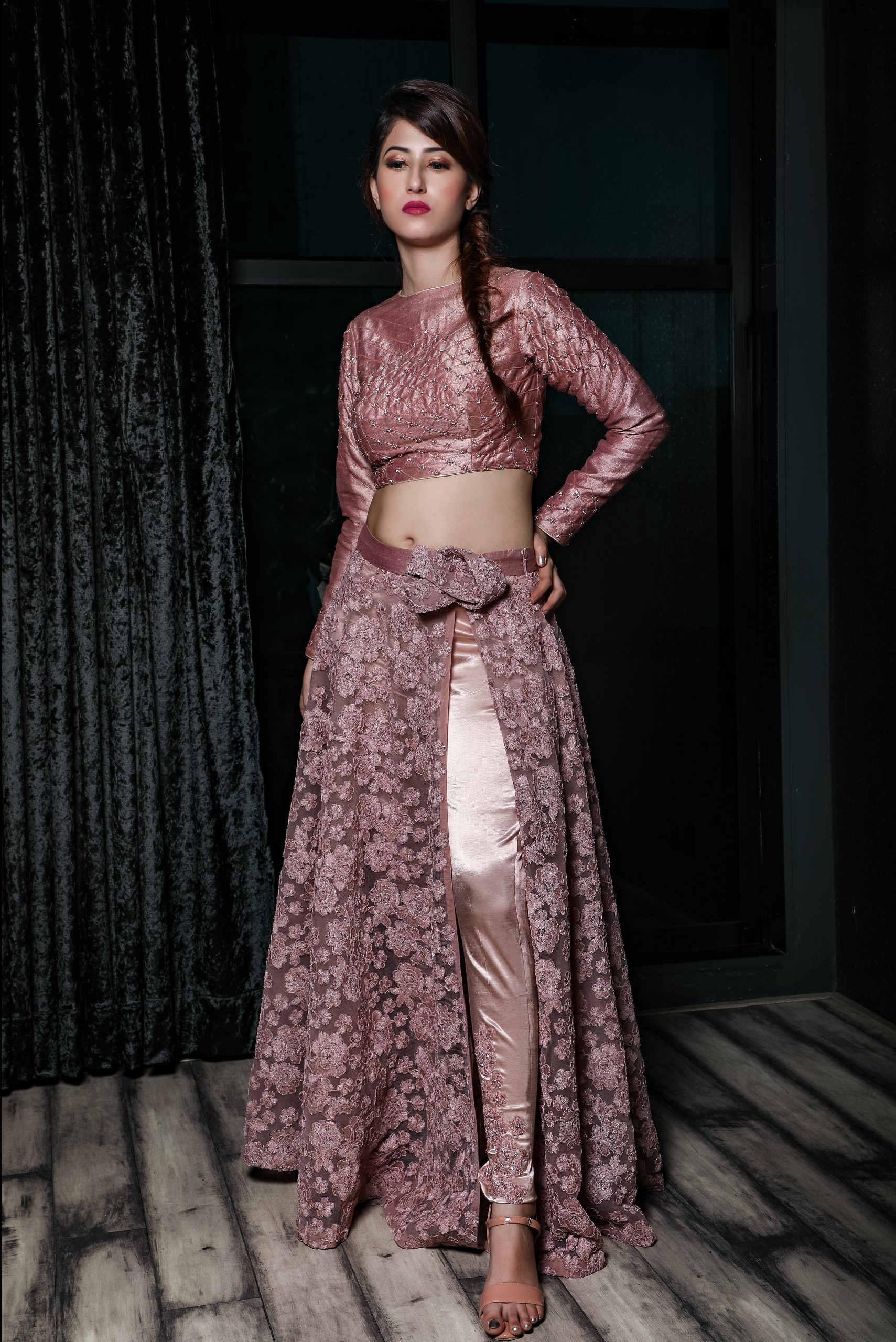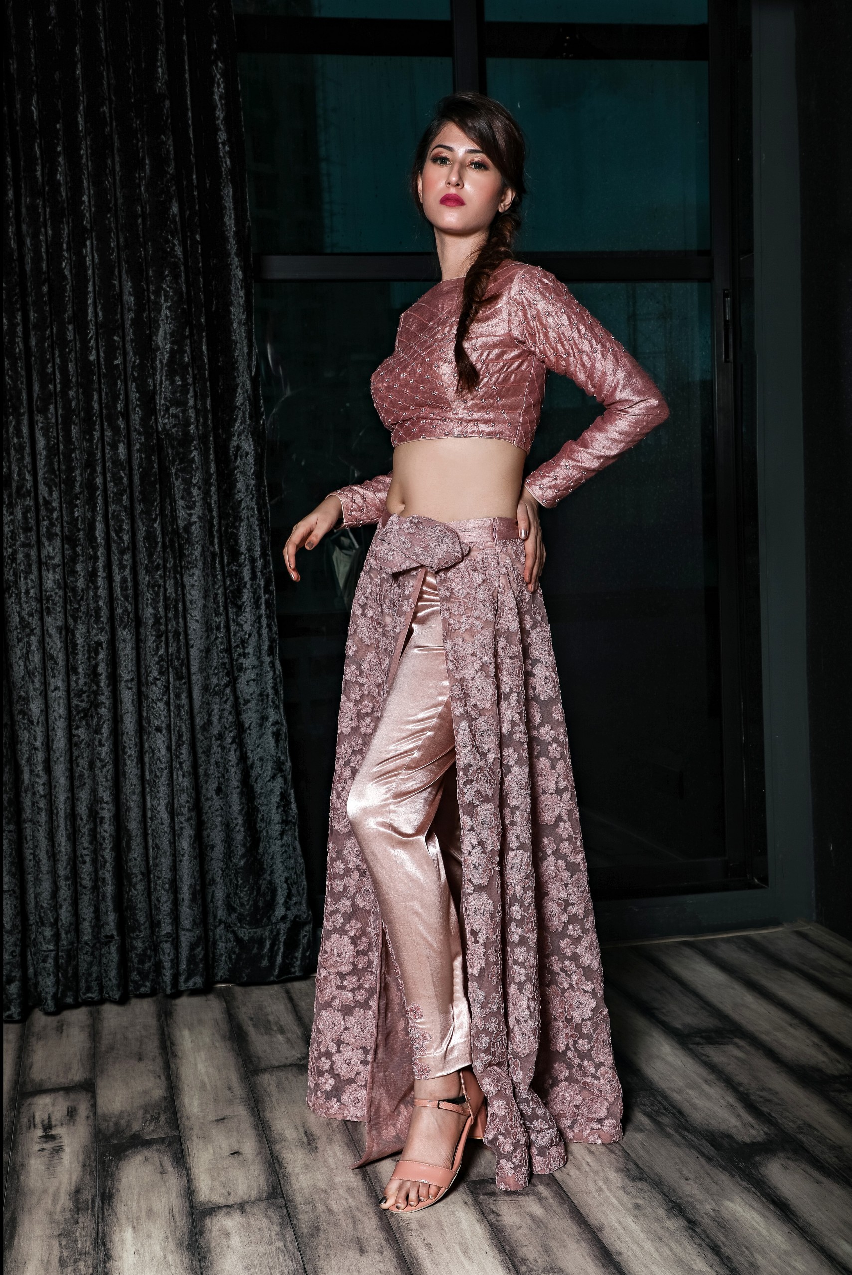 This two piece set made of swiss net embroidered skirt with satin pencil pants paired with silk embroidered blouse.