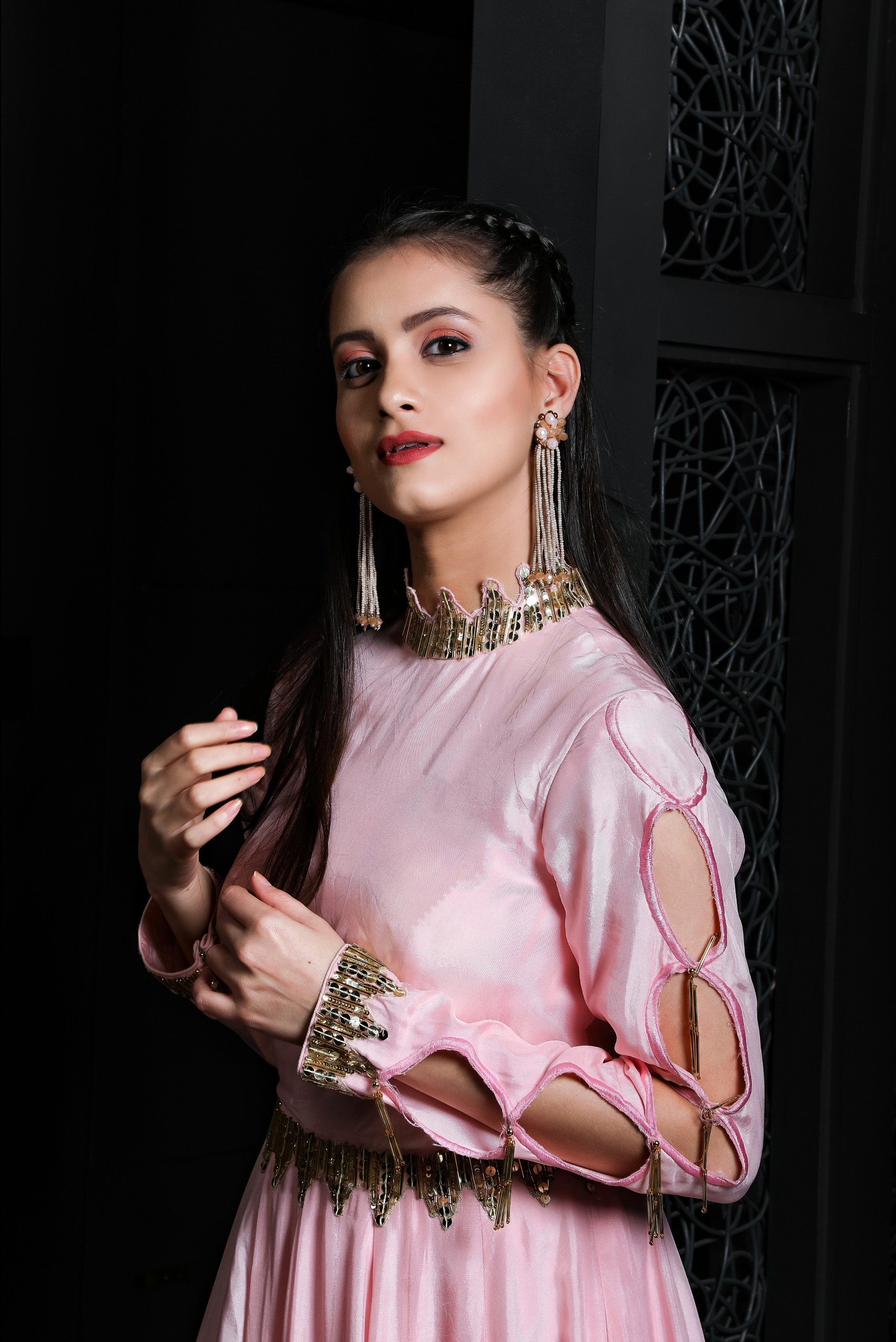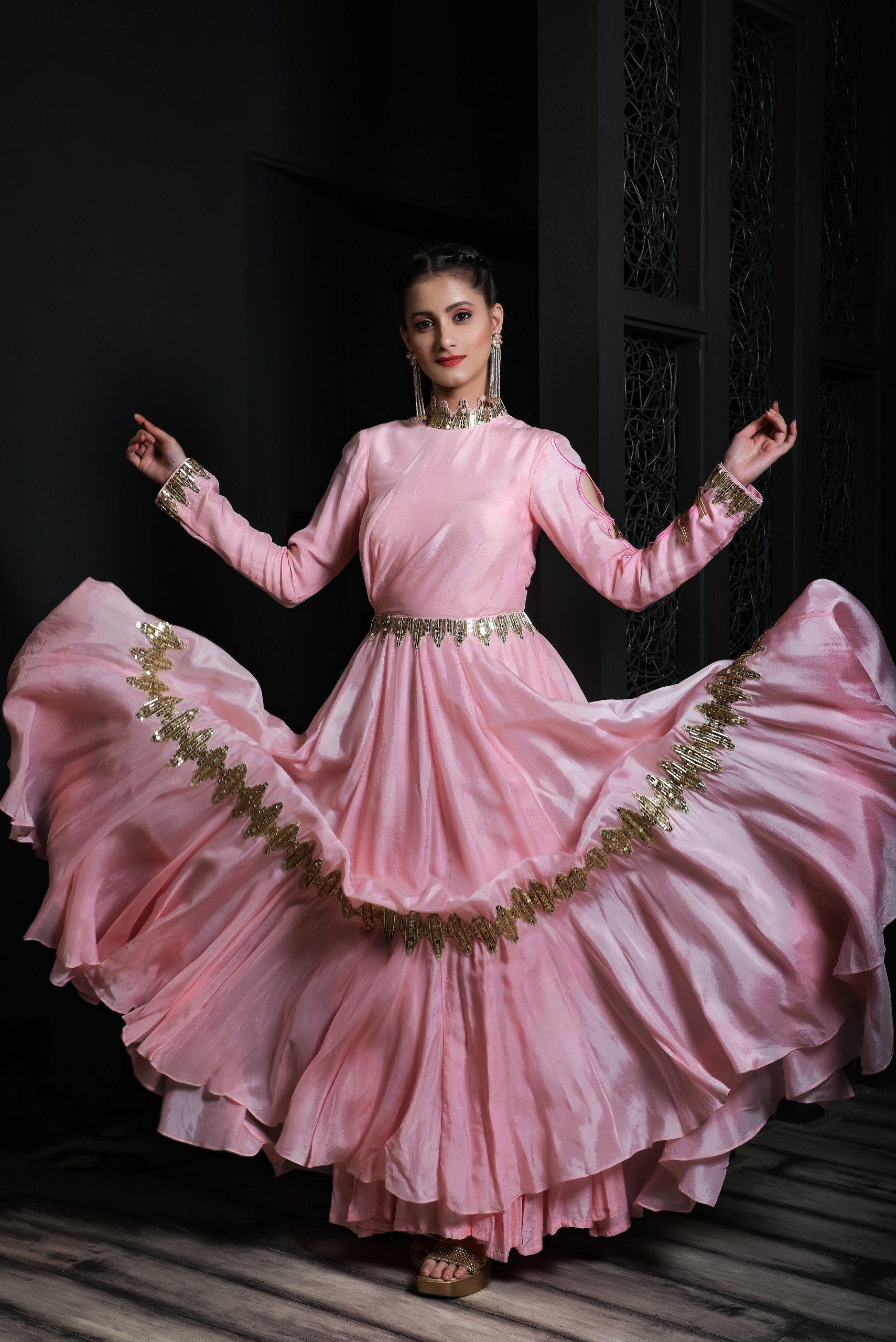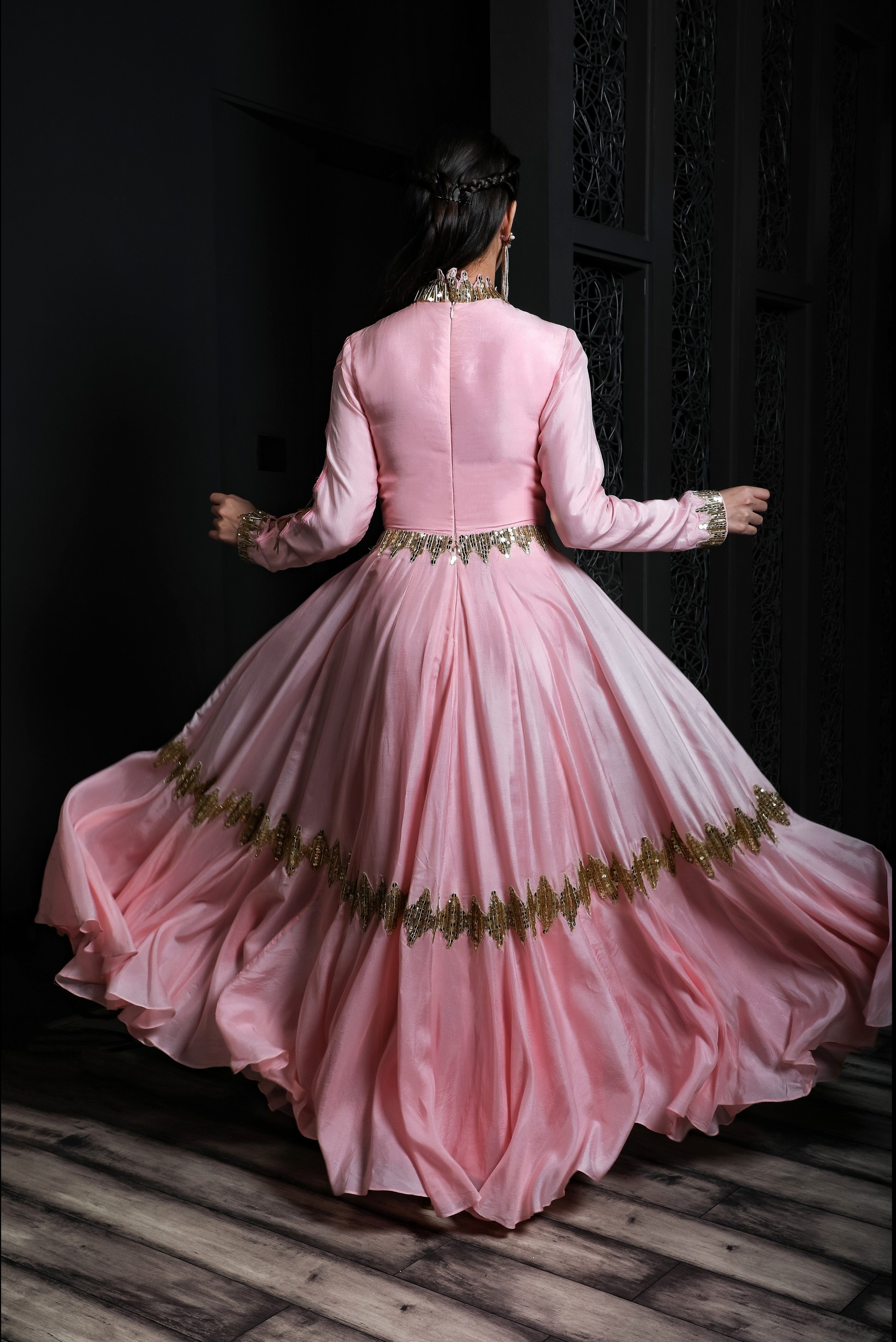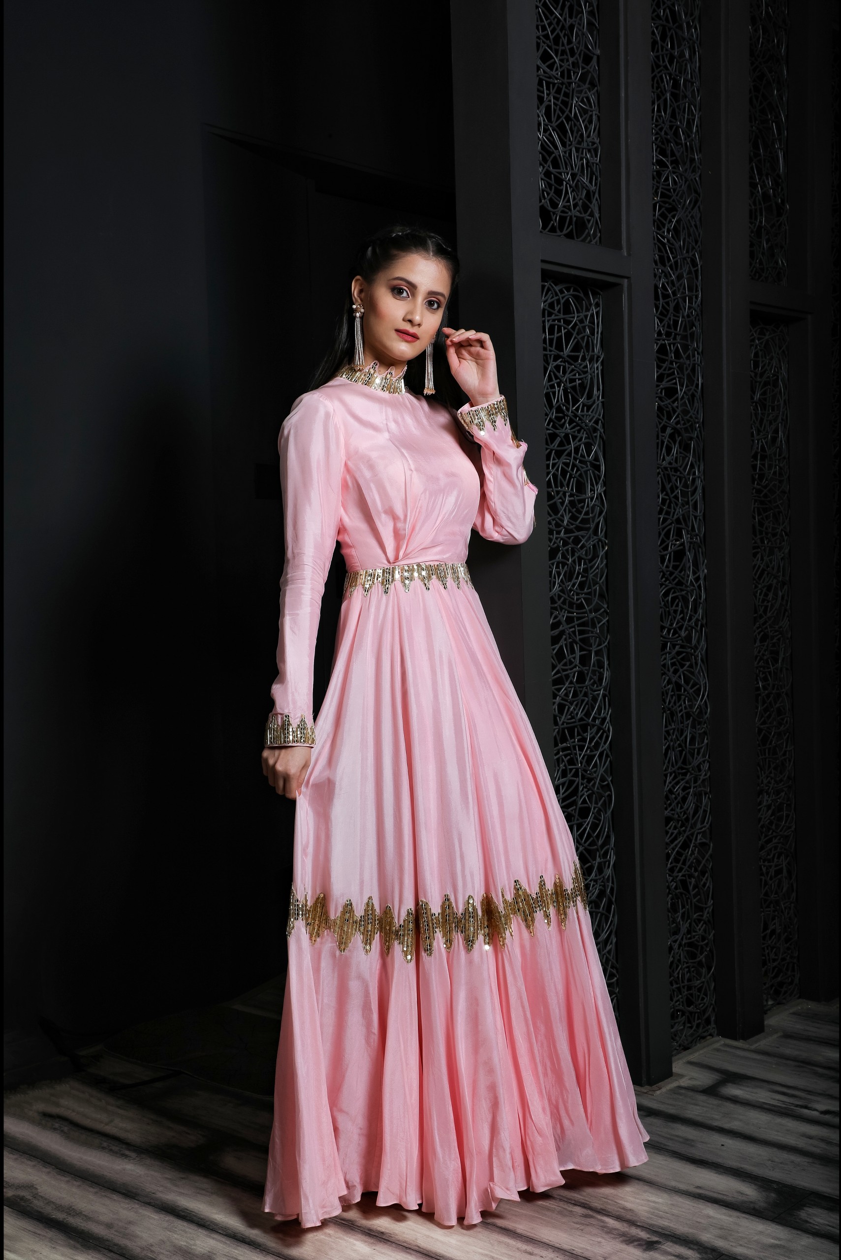 This pink flared gown made of silk with light embroidery covering the neck, waist, wrist, bottom flare and have asymmetric sleeves cut.