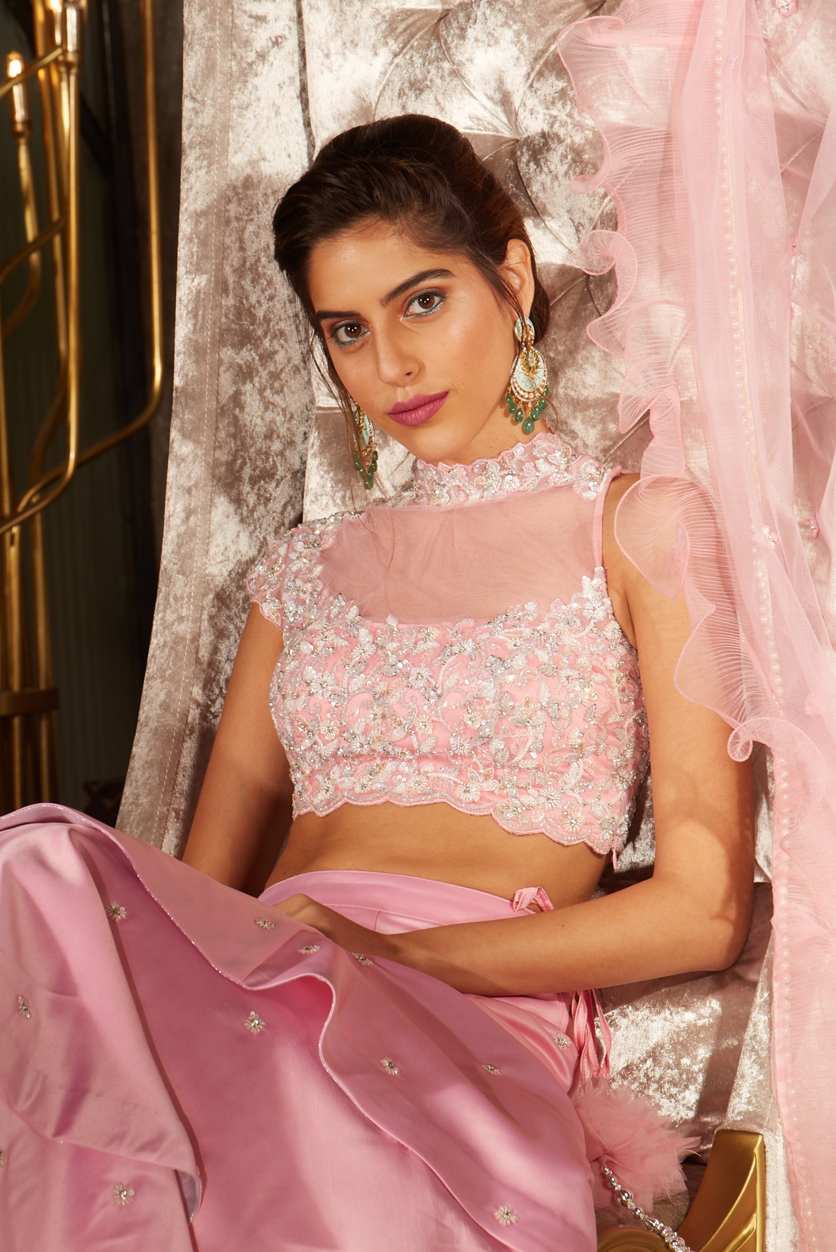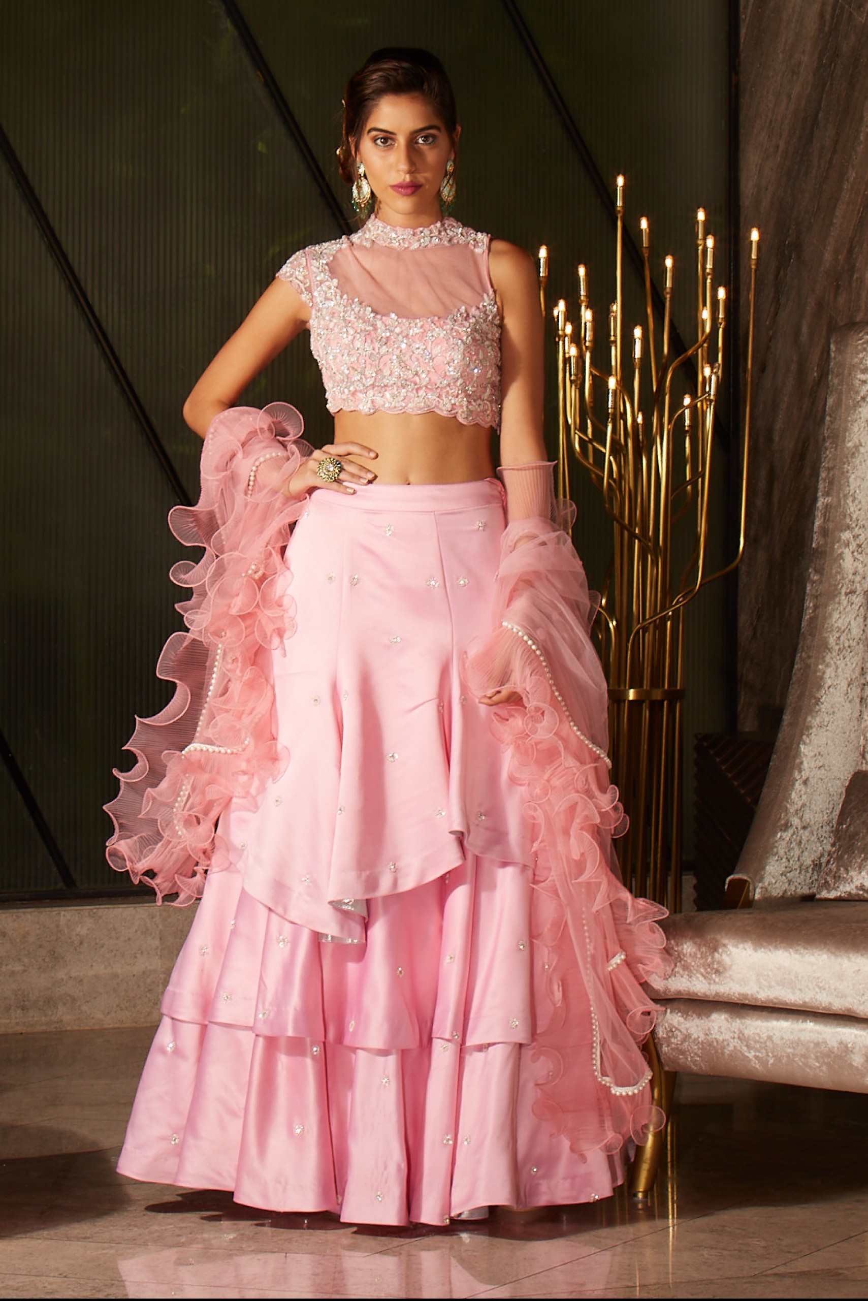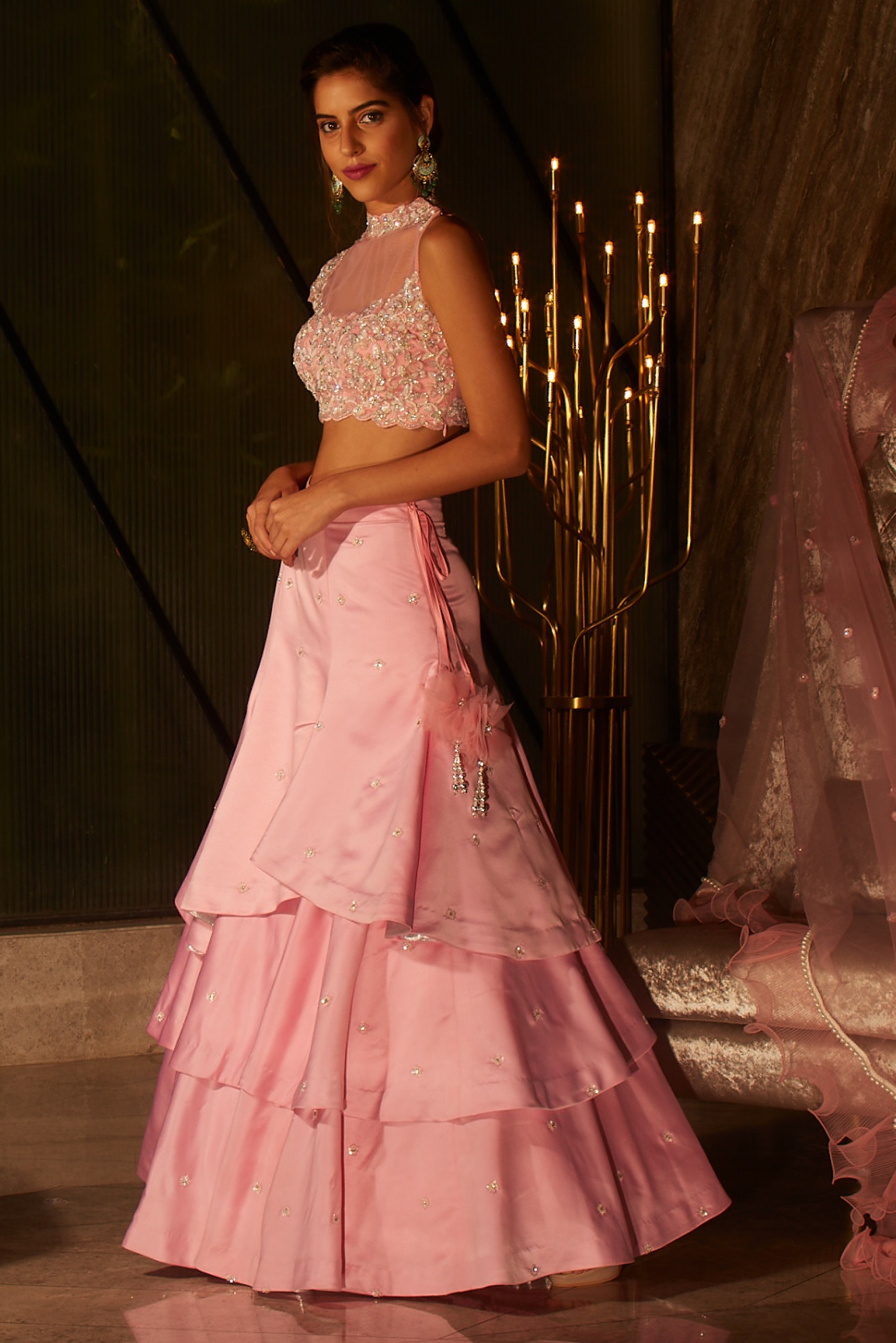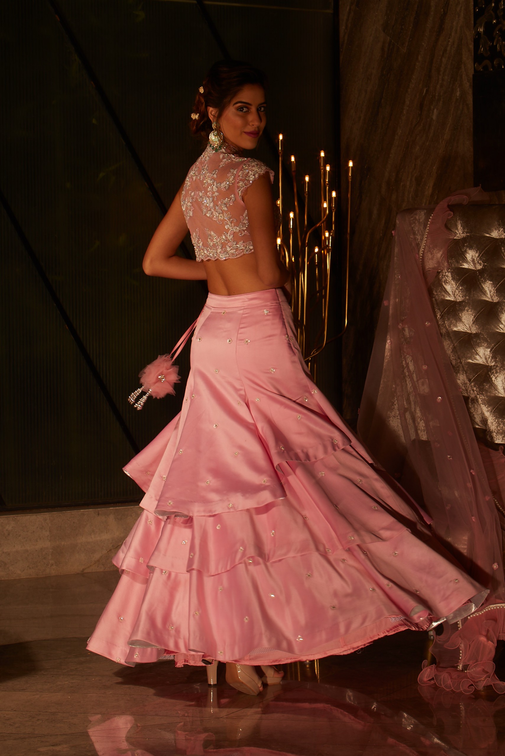 This pink lehenga is made of satin and net blouse embellished with zardosi embroidery paired with three layered skirt embraced with buttis all over it.