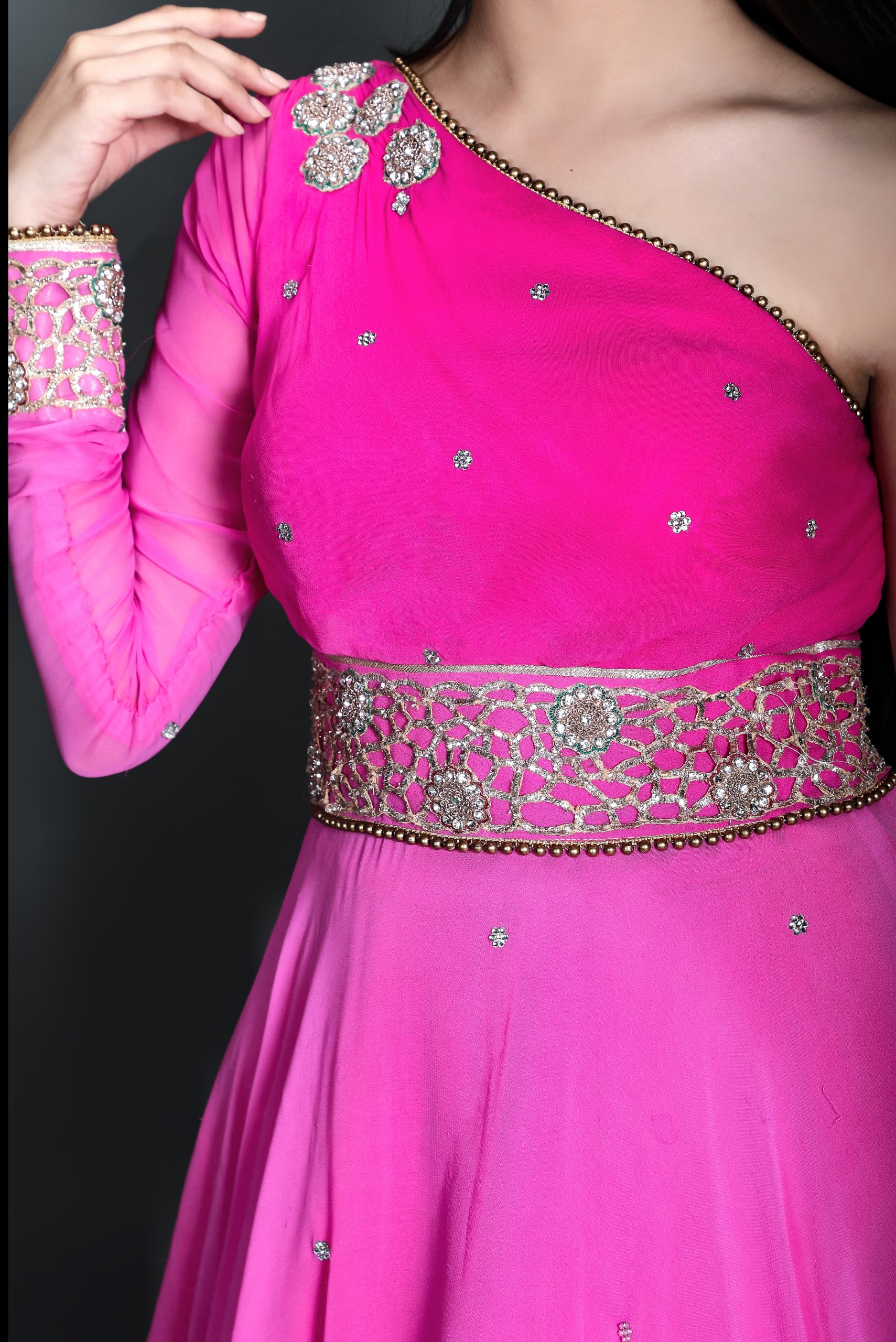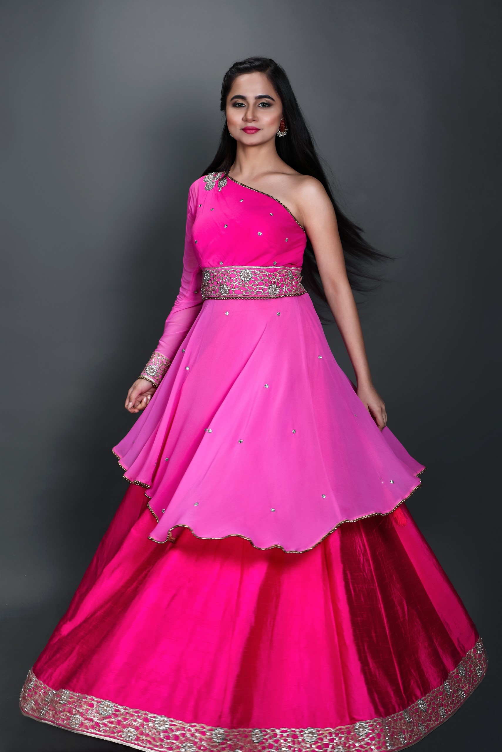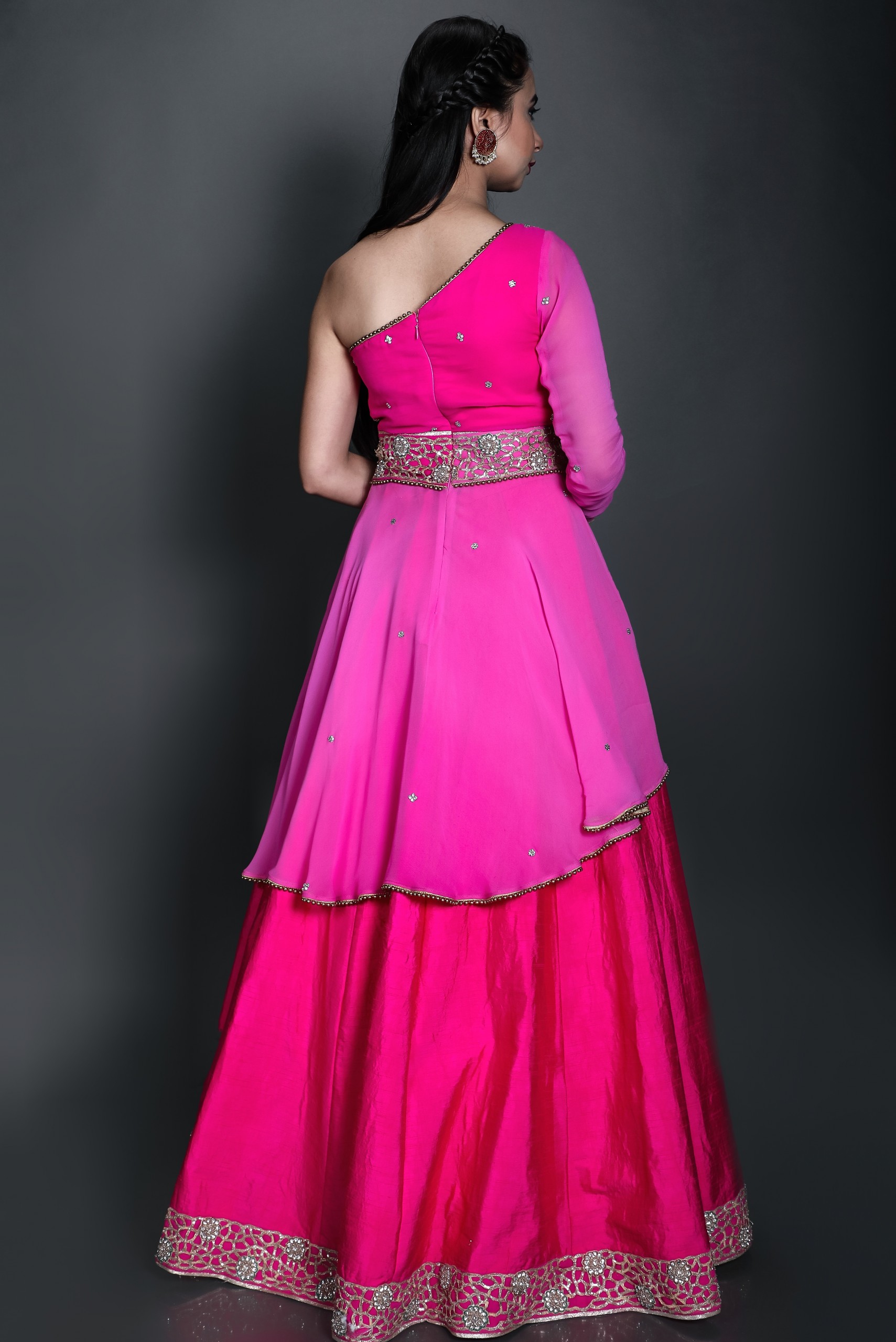This double shaded pink lehenga embraced with embroidered lace with an off shoulder embroidered kurti paired with an embroidered belt.