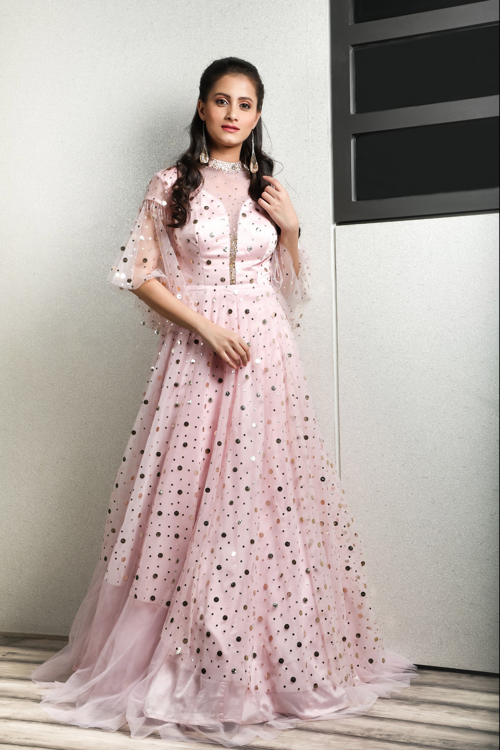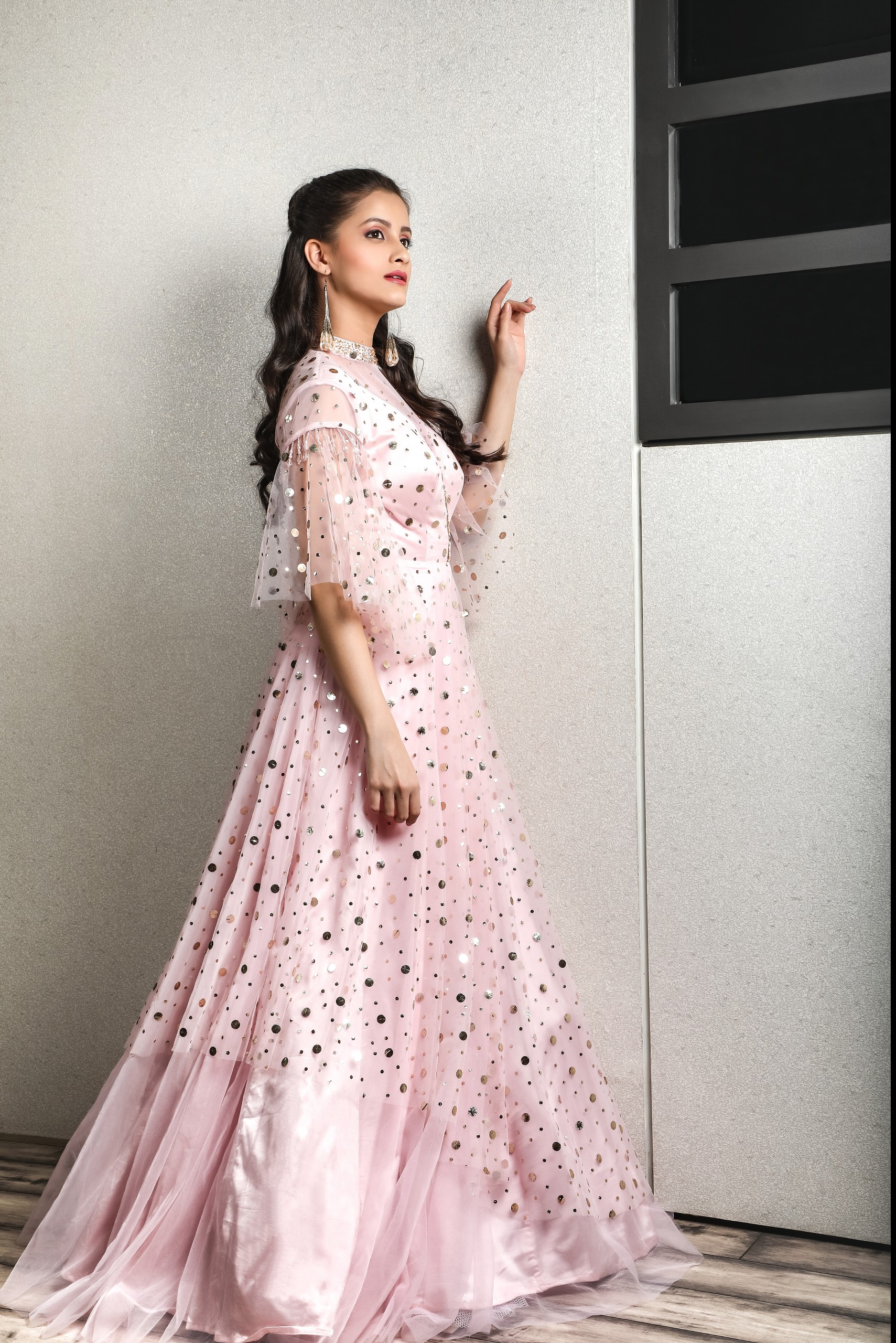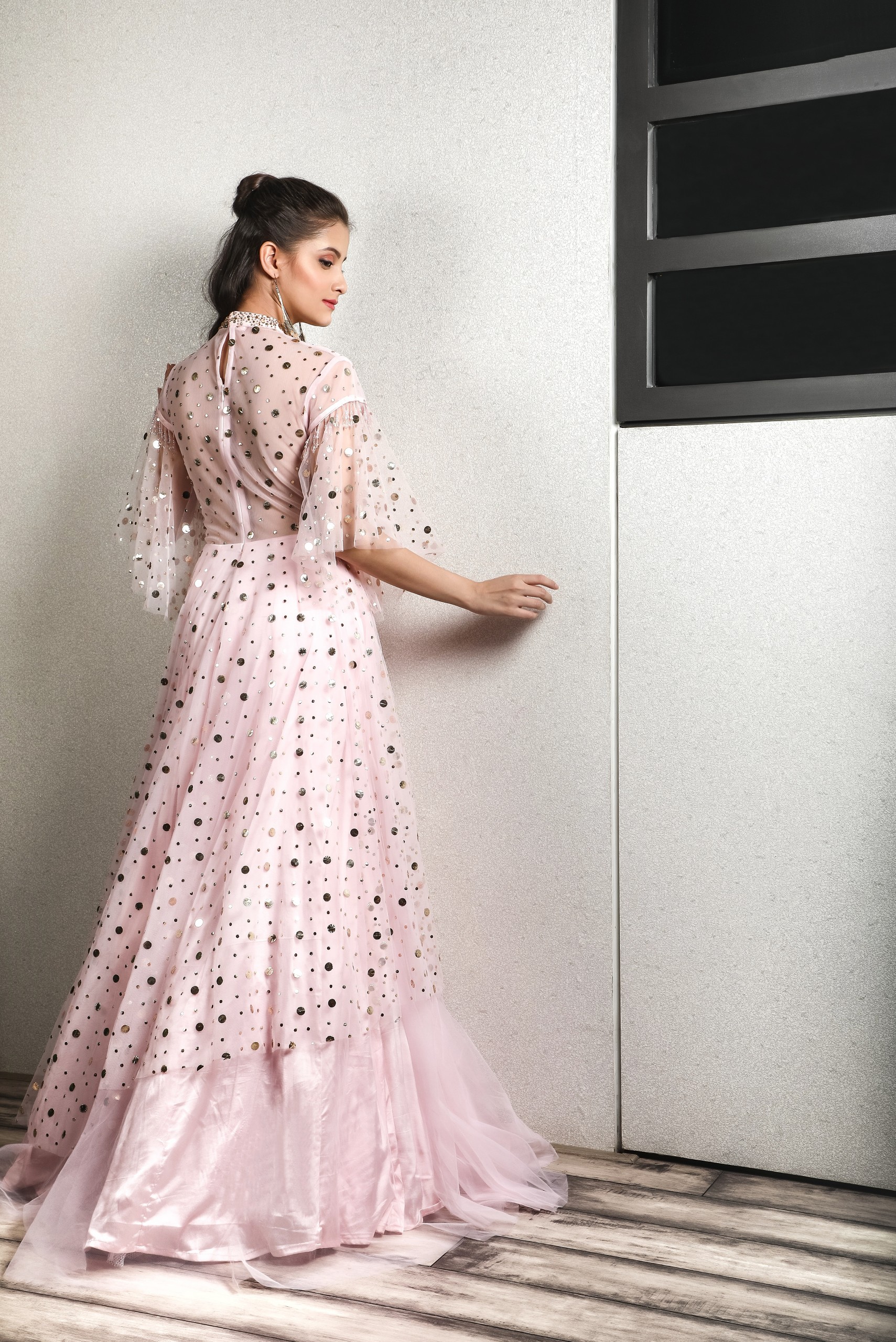 This pink swiss net gown with tiki embroidery embraced with bell sleeves and band collar.