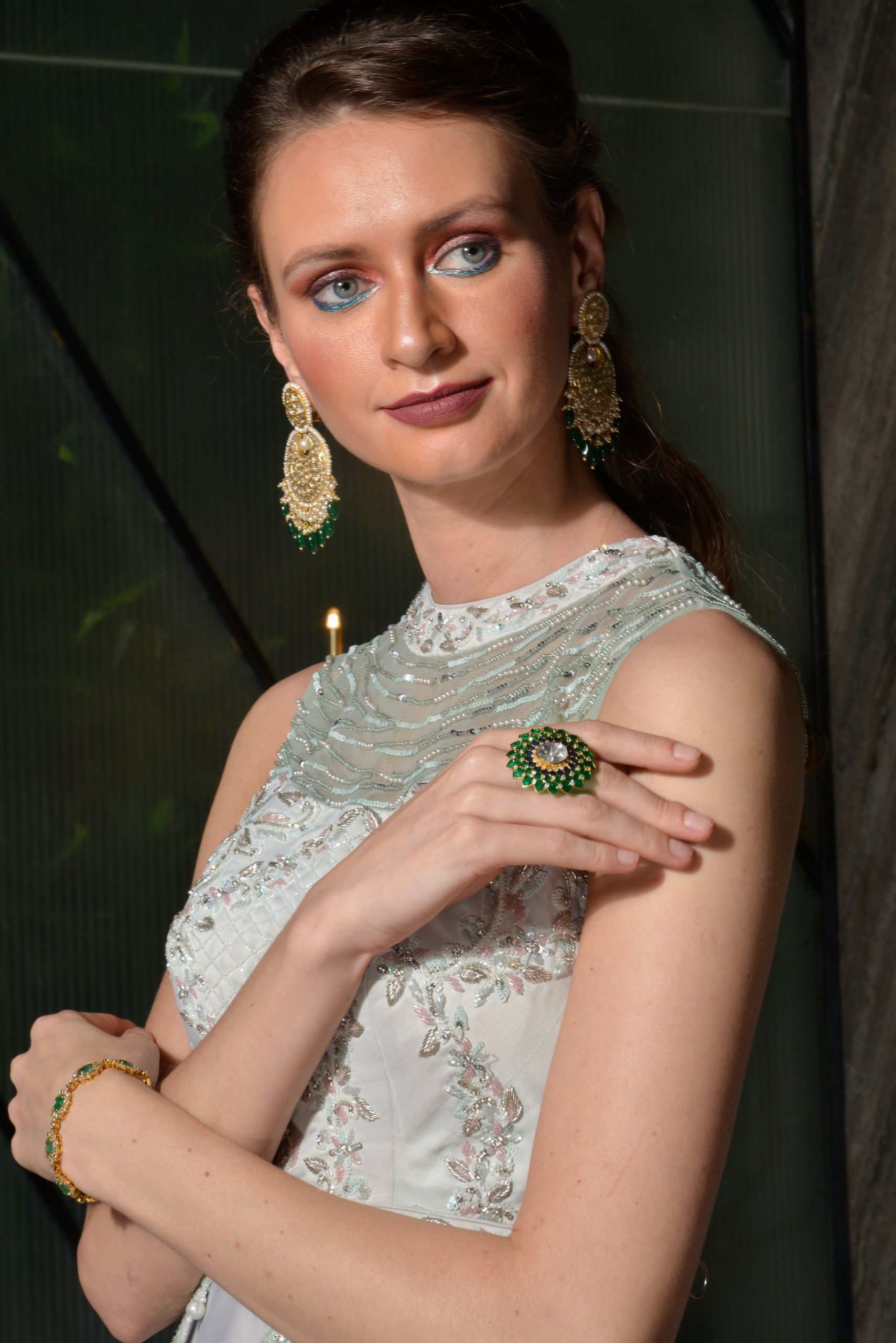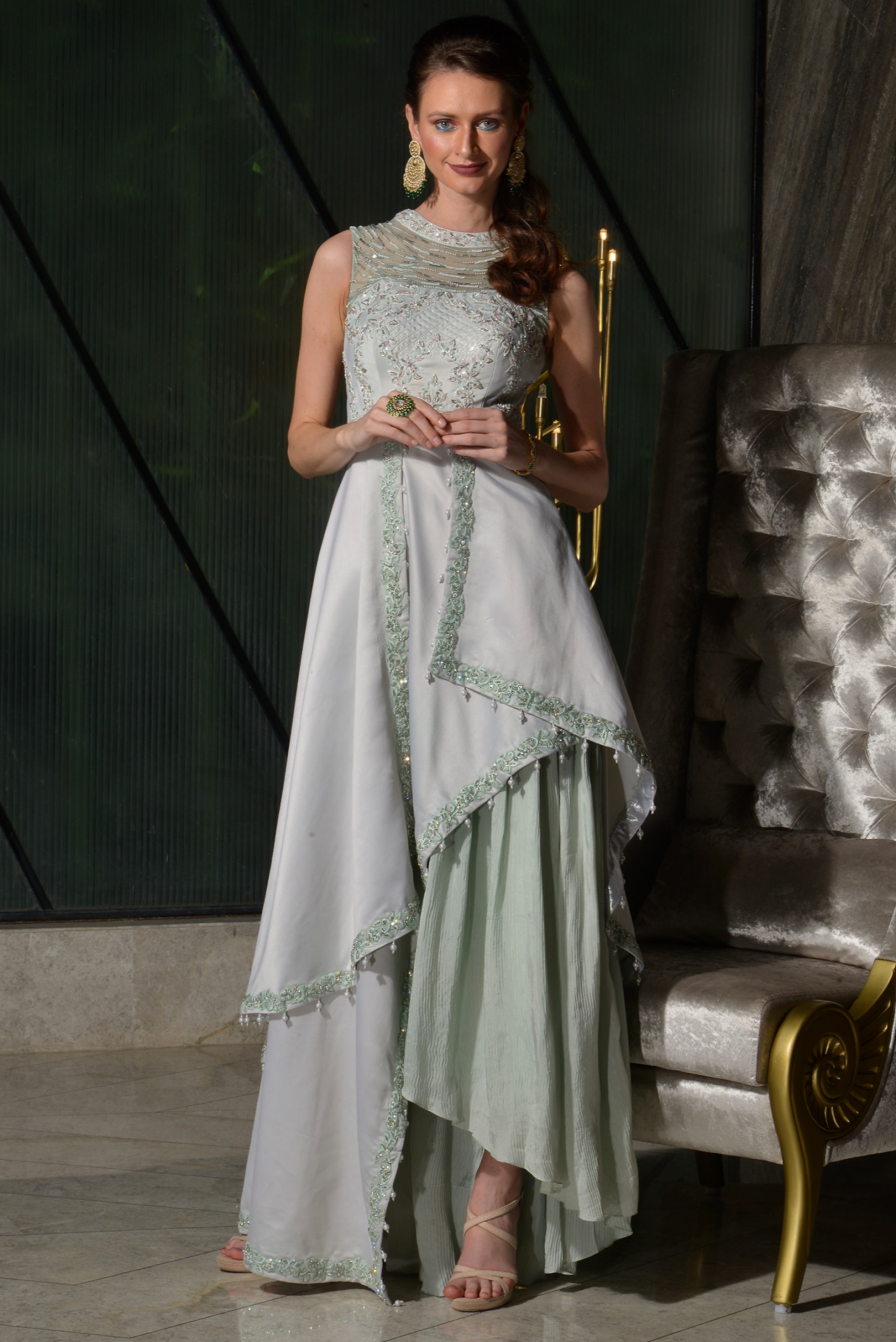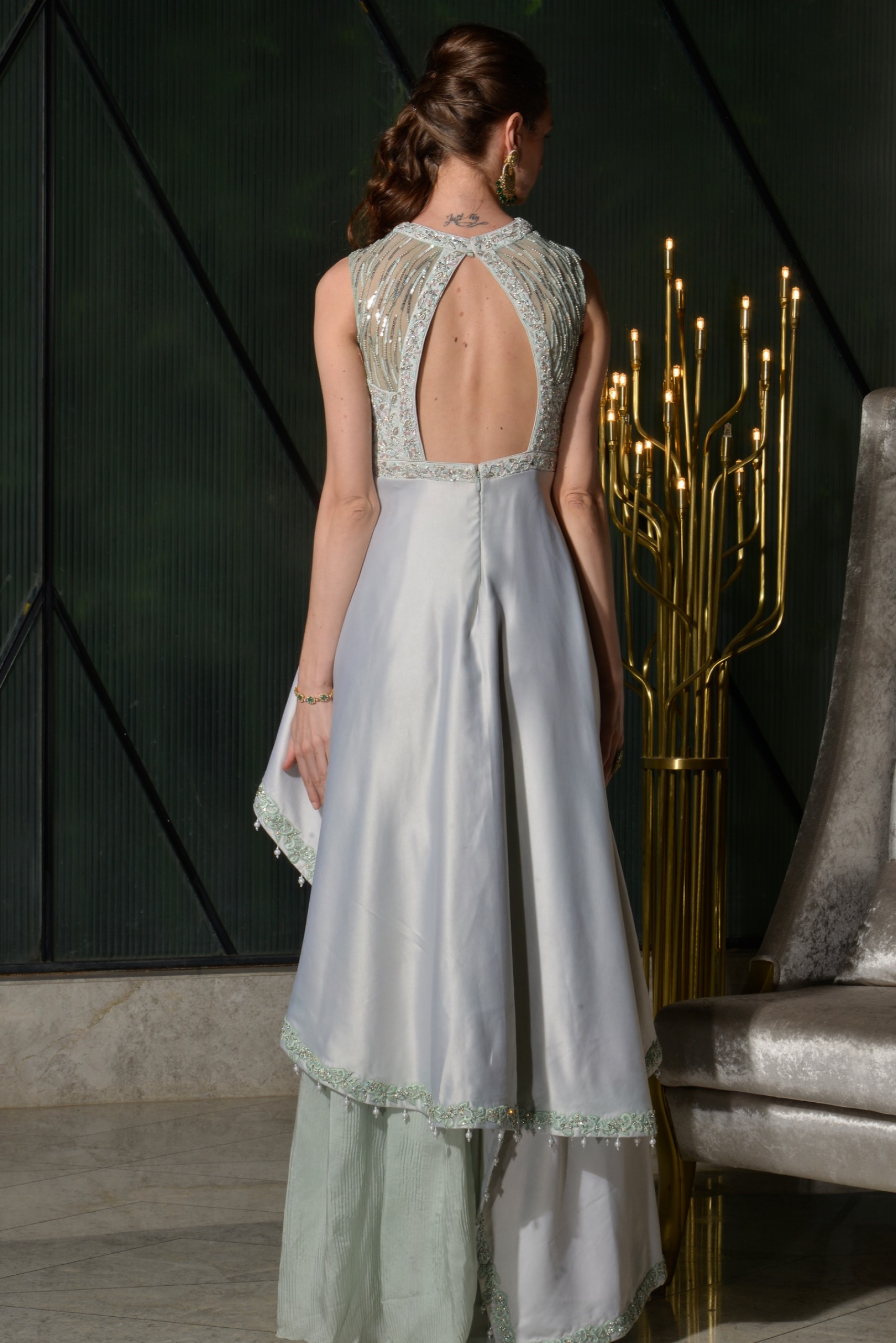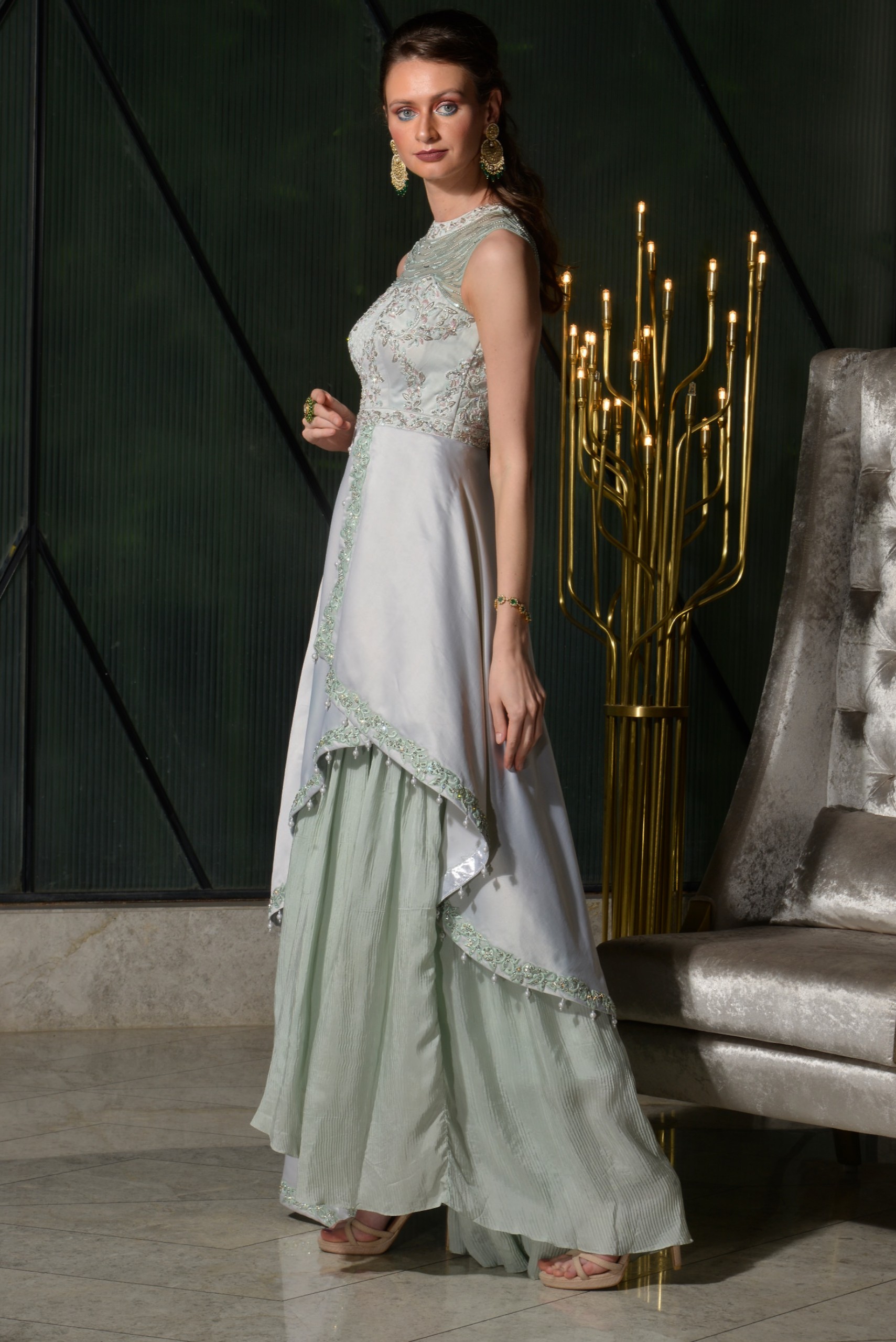 This pistachio green multi layered cut sleeves gown with zardosi embroidery in front and back necklines and tassels on the layered gown.