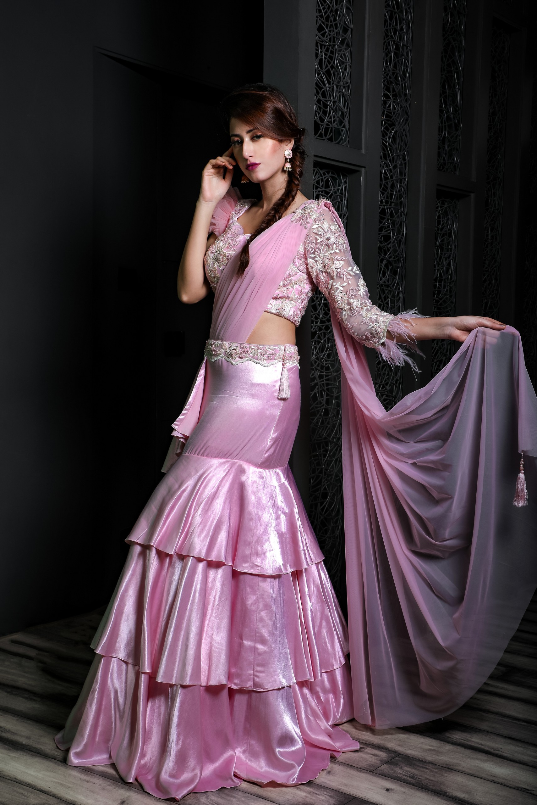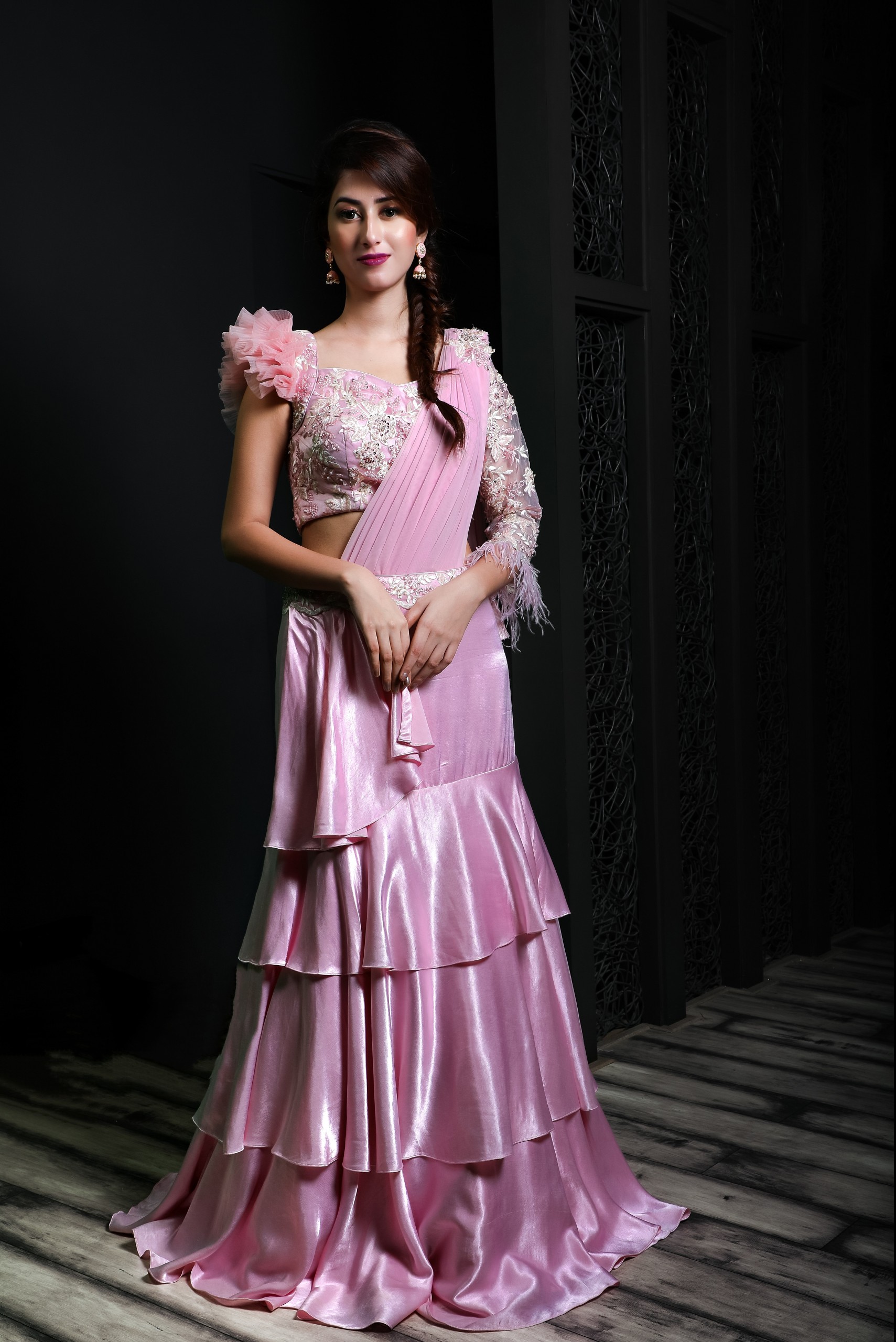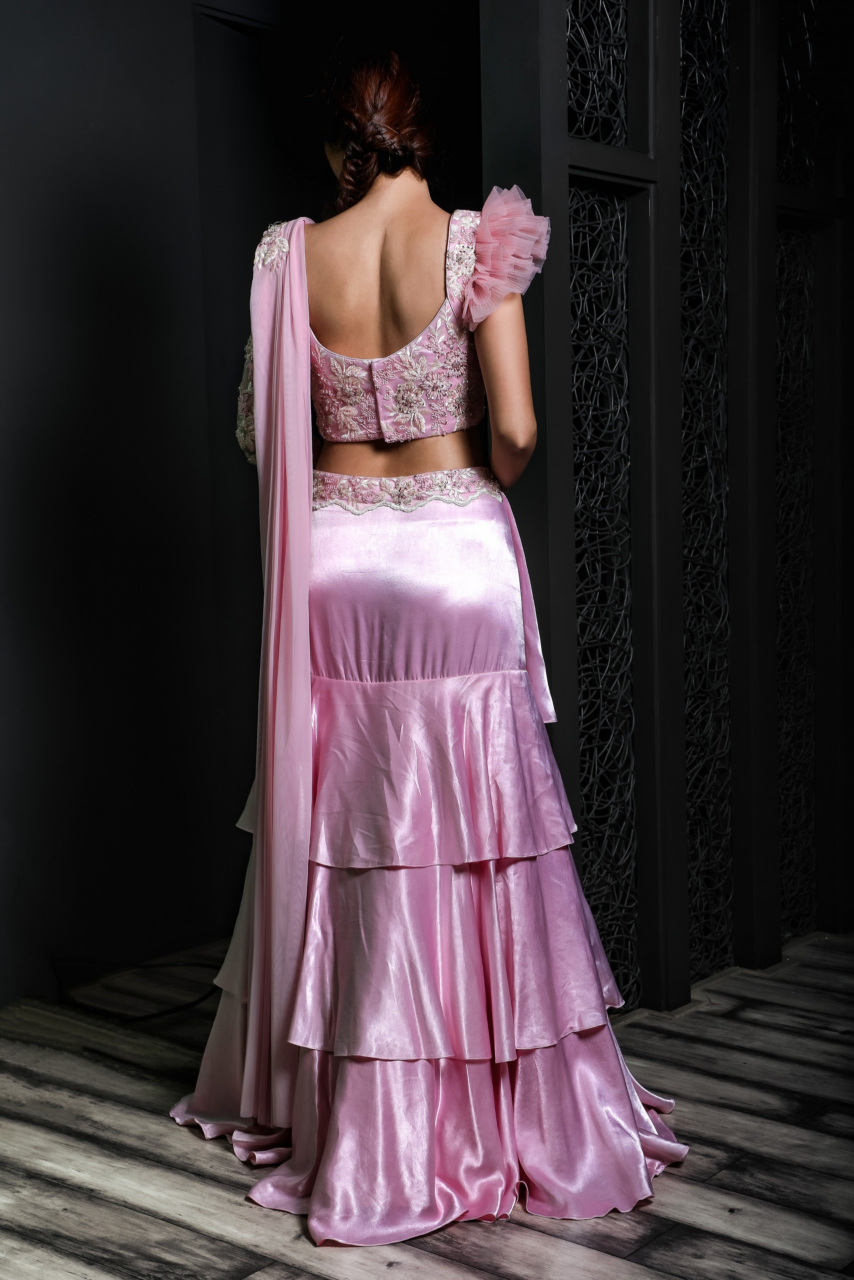 This pink lehenga is made of satin hip fitted layered skirt with an embroidered lace on the waist and attached dupatta paired with an embroidered blouse with one side full sleeves and other side frill sleeves.