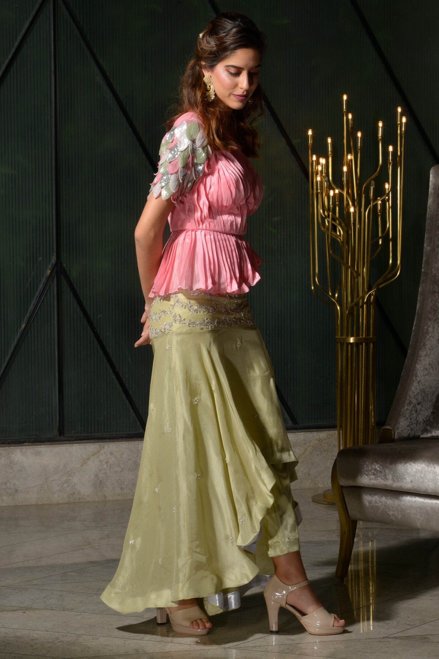 This two color outfit made of pink silk pleated one shouldered top with 3D sleeves on one side paired with high low sage green color silk skirt.