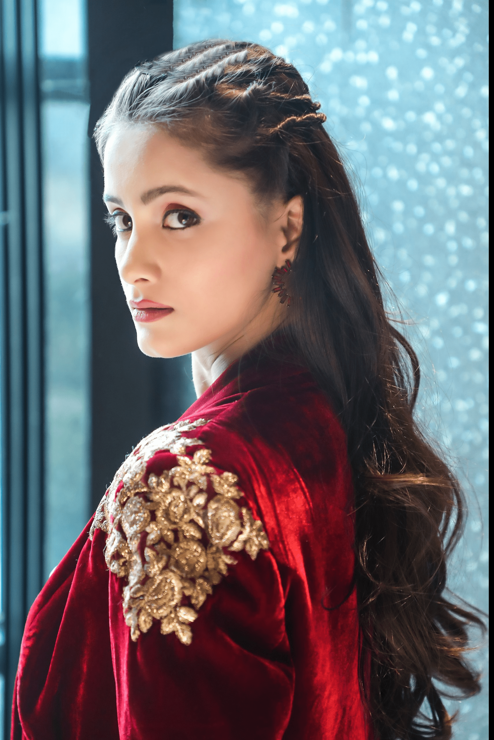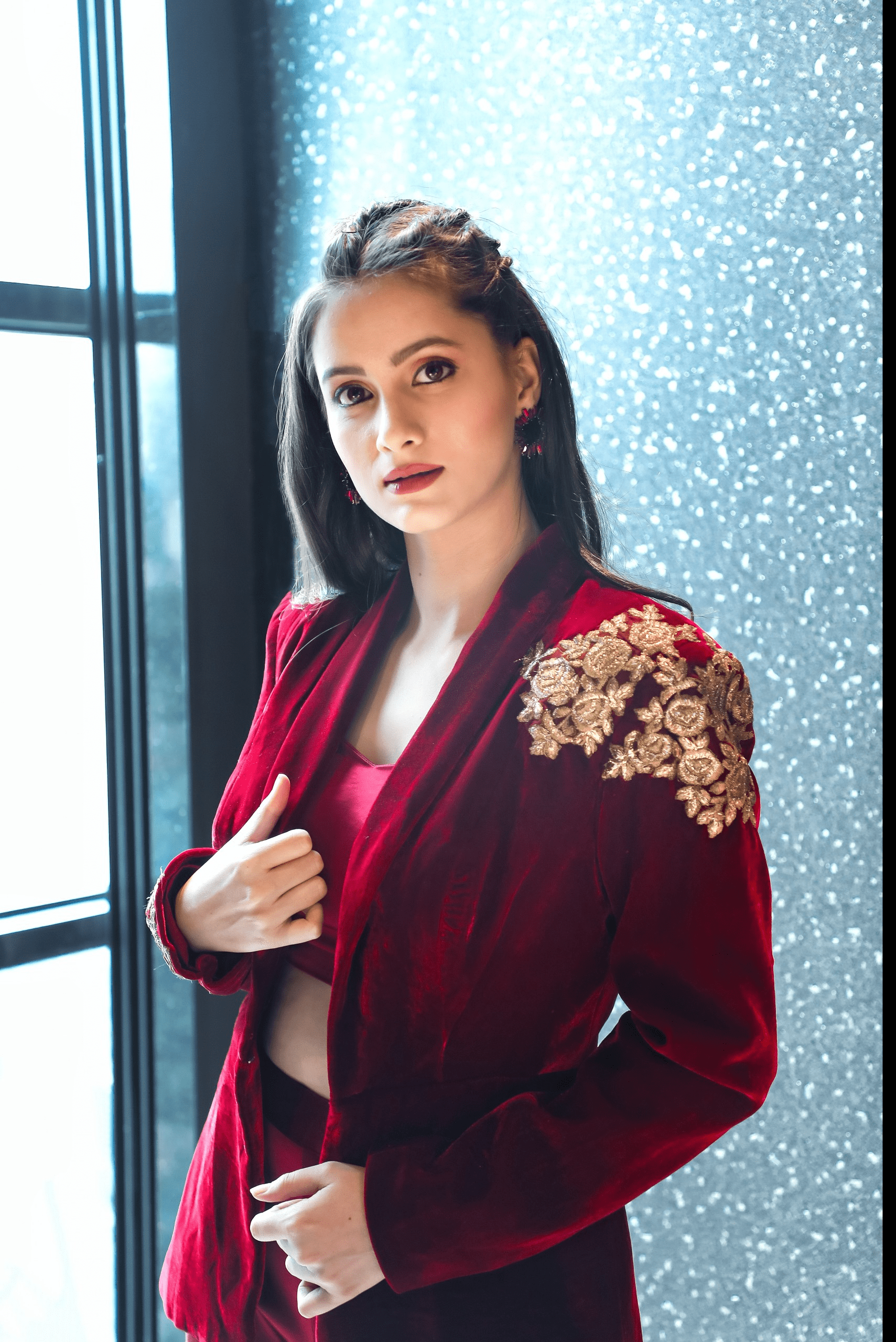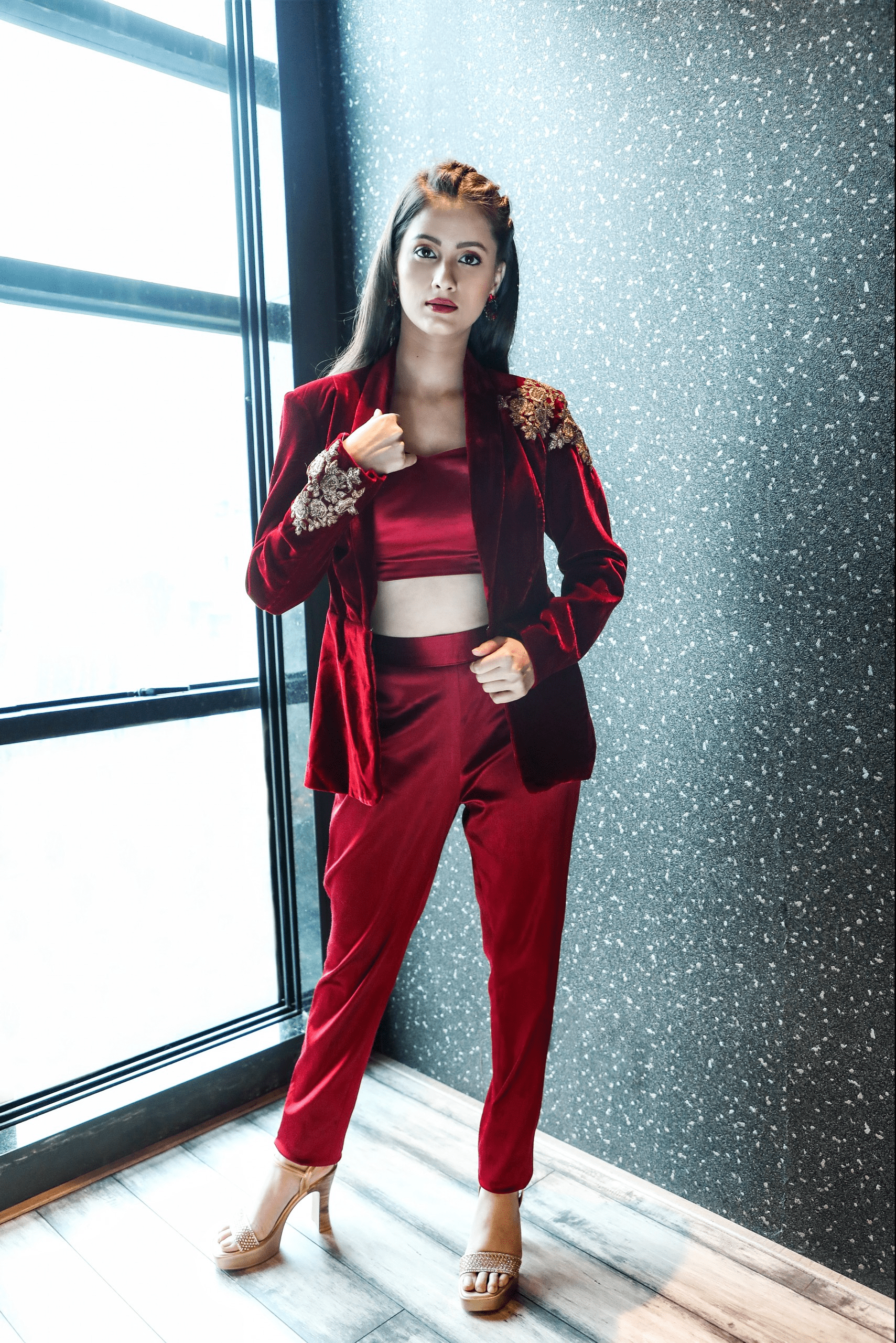 This is a rmaroon velvet three piece suit with plain bustier and pants paired with embroidered jacket with shawl collar.